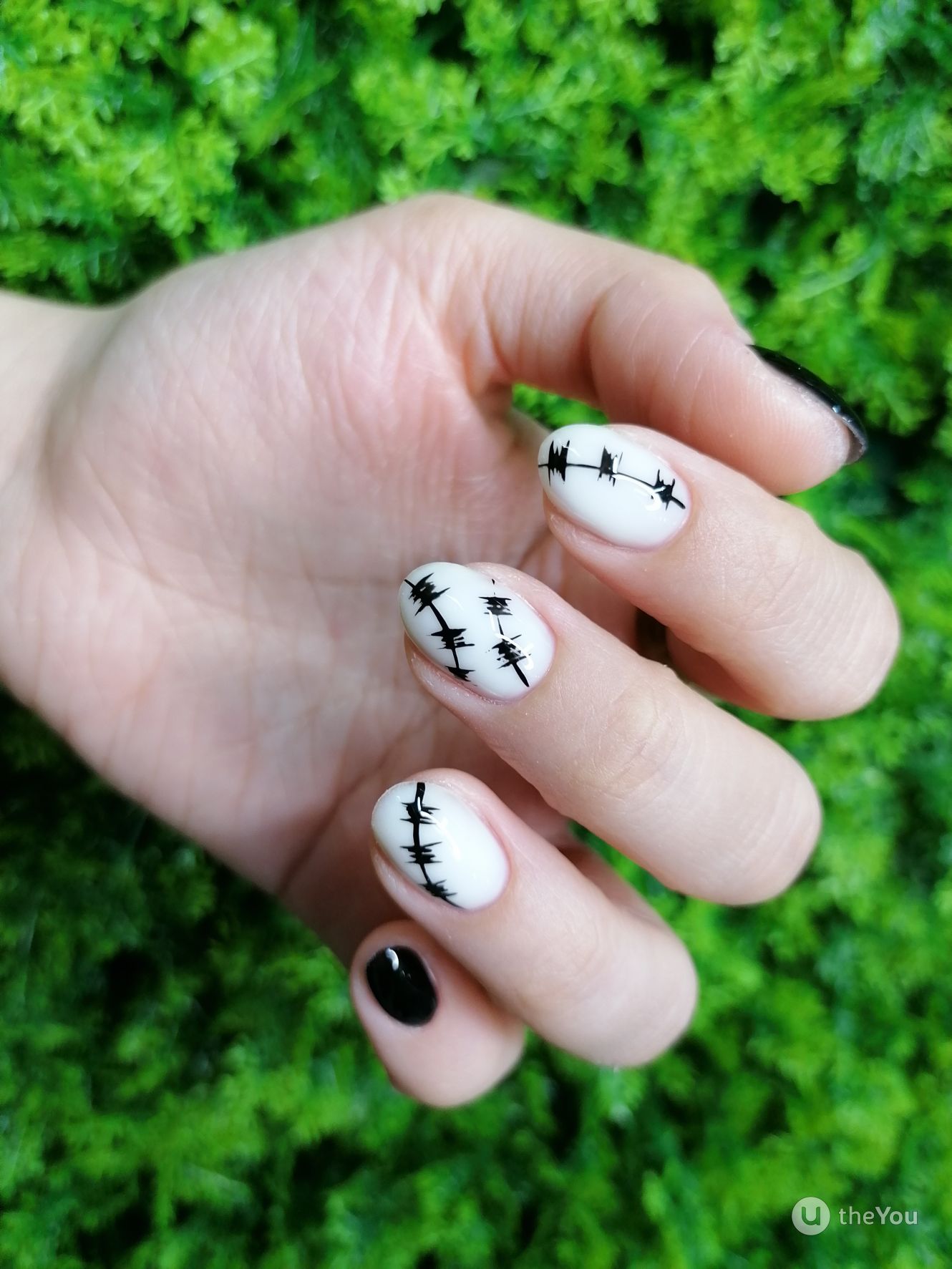 Зрительно вытянет ногтевую пластину маникюр, в котором ноготь вертикально разделён пополам с помощью контраста. Одна половина заполнена чёрным лаком, другая – белым.