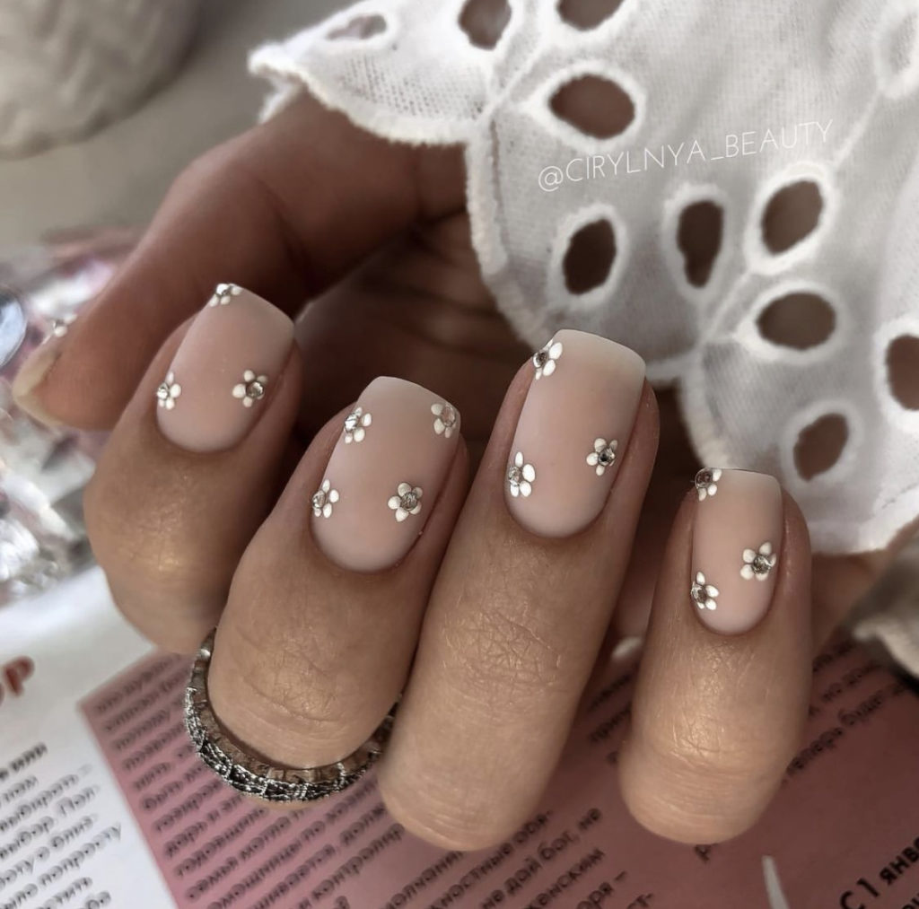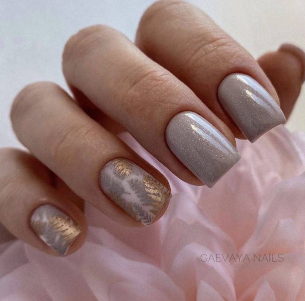 Удачное цветовое сочетание для повседневной носки. Стразы, фольга, блестки с серебряным отливом придадут образу торжественности. В этом сезоне модно лунообразная выкладка в серебре на бежевом покрытии. Из цветных украшений к бежевому хорошо подойдет лавандовый, пепельный в пастельной палитре.