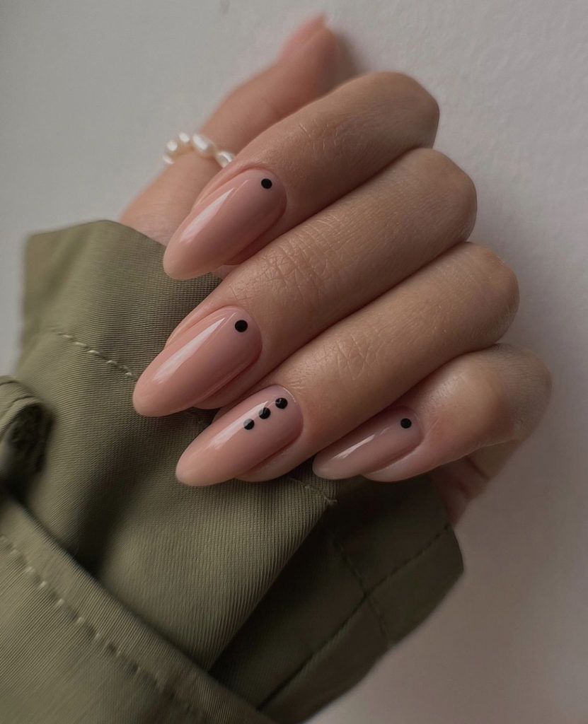 Несмотря на кажущуюся простоту, «брызги» черного цвета по светлому фону (нюд, пастельные тона любого цвета), получившие название «перепелиное яйцо», смотрятся очень интересно и необычно. Как правило, эта техника применяется на всех ноготках. Иногда можно видеть своеобразный «негатив», когда по черному наносят белые пятна.