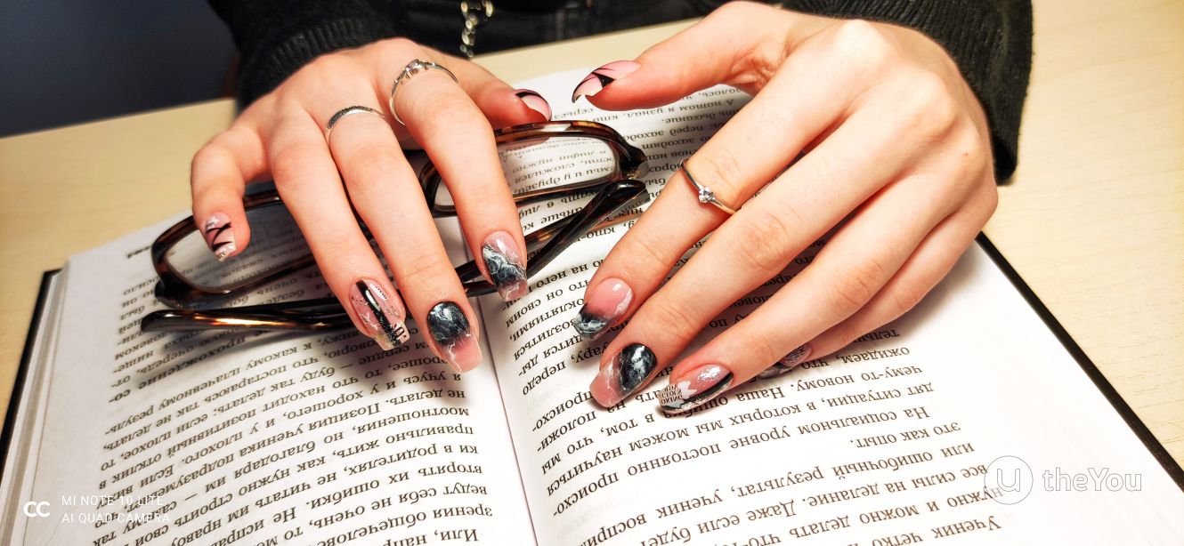 - Черный мраморный маникюр со втиркой — идеальный для длинных ногтей средней длины. Мизинец и указательный палец остаются черными. На безымянном делают мраморную фактуру (белый ли розовый фон). На ногтевую пластину среднего пальца наносят интенсивный серебристый пигмент;