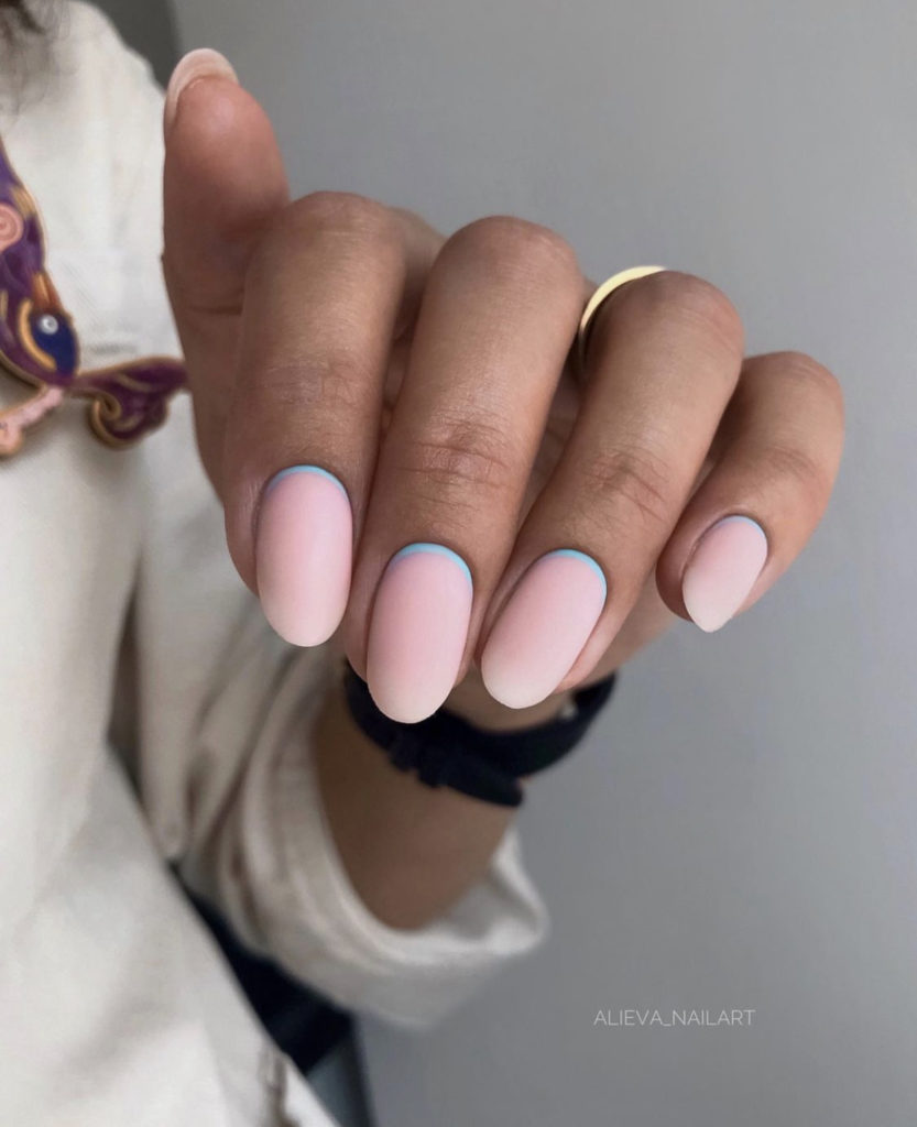В качестве синего оттенка может использоваться не только синий цвет, но также и цвета из его цветовой гаммы. Например, голубой, бирюзовый или ярко-синий будут интересно смотреться в комбинации с серым или черным цветом. Многие мастера используют эти оттенки при выполнении омбре. Для декора используют материалы в виде вензеля, блесток или камней.