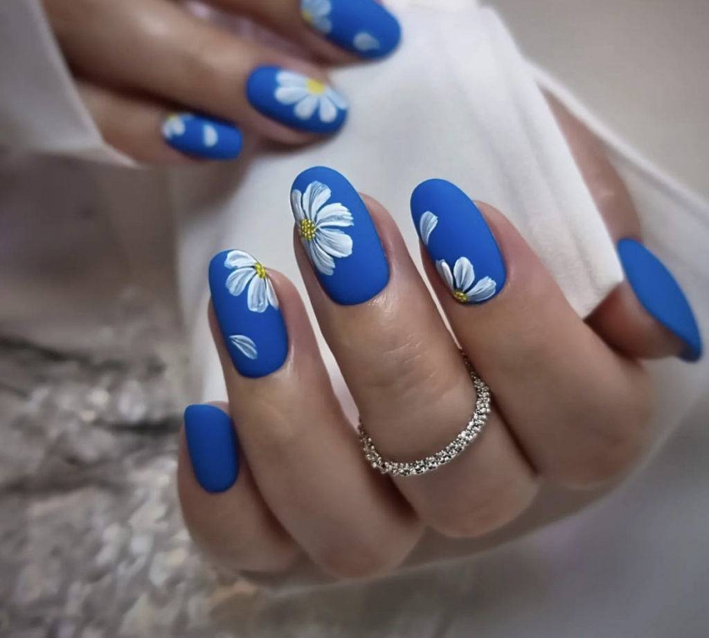 Это один из самых удачных примеров красивого маникюра. Матовое оформление подчеркивает женскую привлекательность. Синий цвет универсален, при нанесении макияжа можно выбрать синие тени, которые подходят всем без исключения. Таким образом создается образ целостности и единства. Если акцент сделать лишь на безымянных пальцах, образ будет элегантным и лаконичным. Это мощный акцент в прекрасном внешнем облике