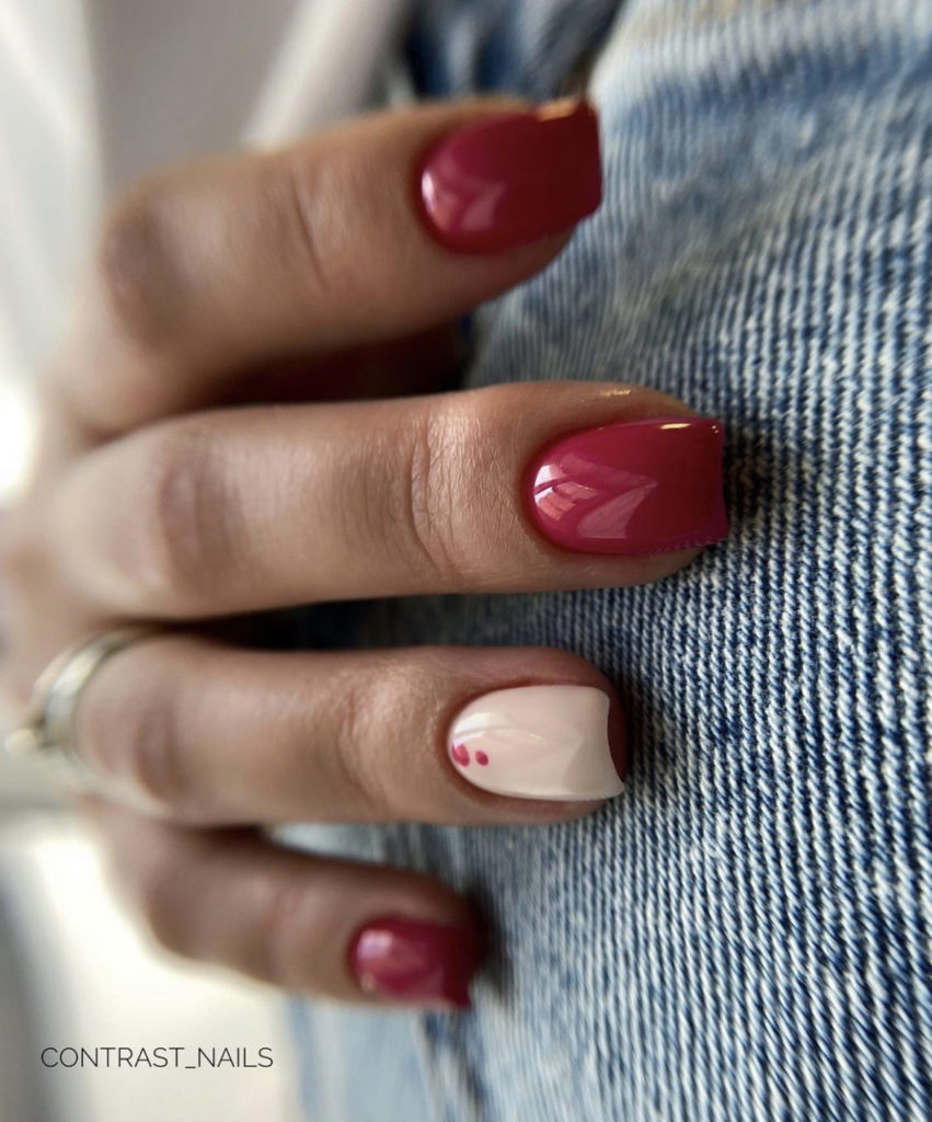 Цветовое сочетание, призванное добавить образу много шарма. Если вы хотите сделать еще более яркий акцент, можно добавить блесток, страз. Более сдержанно такой тандем смотрится на коротких ногтях. Особенной популярностью в этом году пользуется кружево на яркой подложке.
