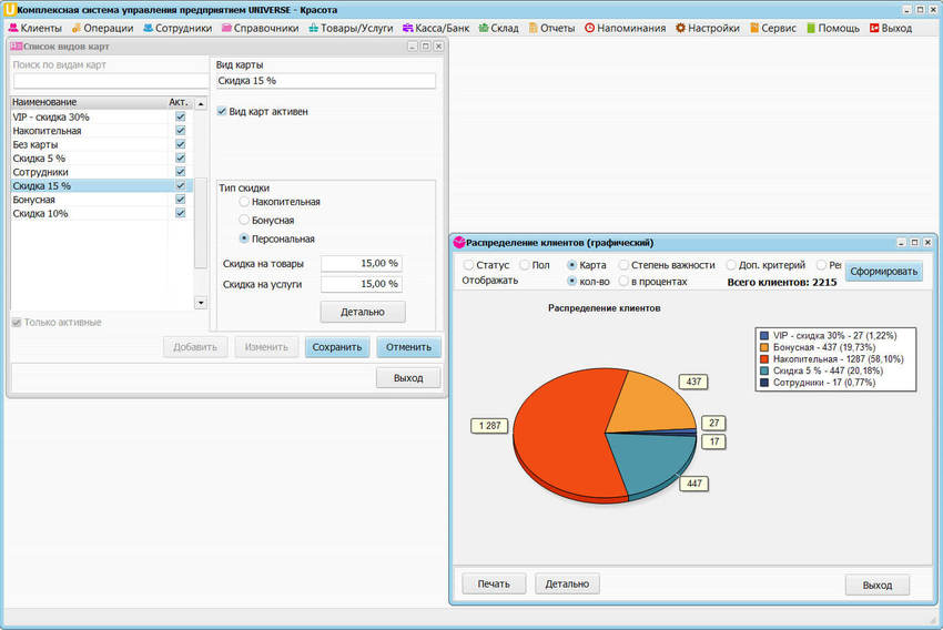 Одной из возможностей программы UNIVERSE-Красота является управление бонусной программой лояльности, запуск временных маркетинговых акций, работа с системой карт постоянных клиентов в салоне красоты. Система дисконтных клиентских карт — это дополнительный стимул для привлечения клиентов к вашему салону красоты. Первичному клиенту нужно показать, что вы заинтересованы в долгосрочных отношениях и с радостью будете принимать его в своем салоне красоты. А выдача посетителю дисконтной пластиковой карты или бонусной онлайн карты постоянного клиента является прямым подтверждением ваших желаний. В зависимости от поставленных задач, вы можете внедрить в своем салоне красоты абсолютно любую программу лояльности для постоянных клиентов.