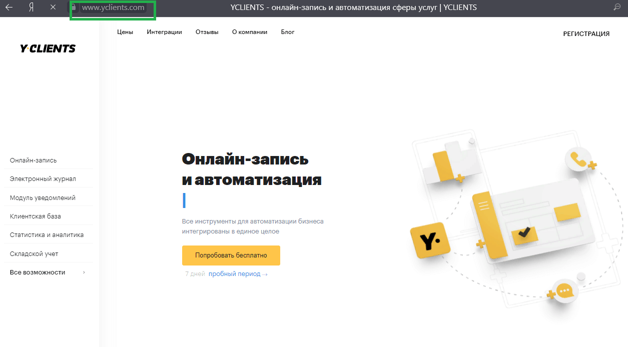- Откройте веб-браузер и введите адрес https://yclients.com в адресной строке.