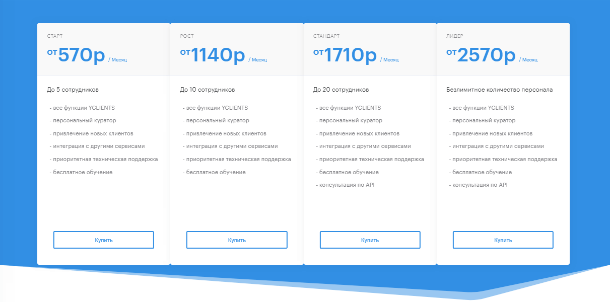 Стоимость зависит от выбранного тарифа и периода, на который он оплачивается. Выгоднее получается покупать на год и более – в этом случае Yclients дарит дополнительное время в подарок. Так, например, при оплате на 1 год еще 6 месяцев ты получишь бесплатно. Стартовый тариф обойдется 733 рубля в месяц, а самый расширенный «Лидер» — 3333 руб. в месяц.
