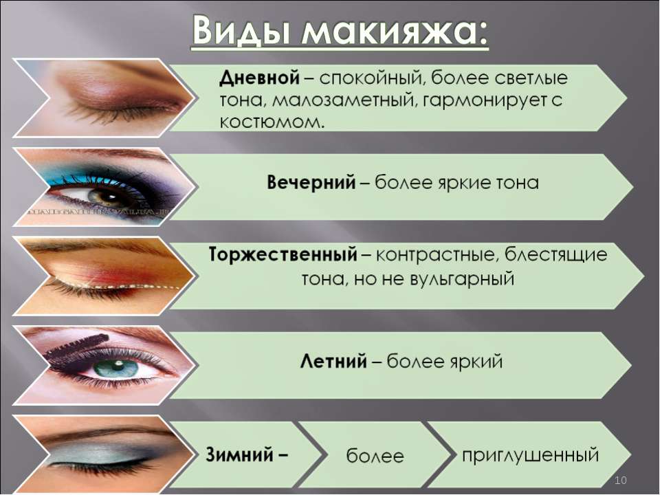 Они подбираются под то, что требуется в итоге, например следующие типы макияжа: