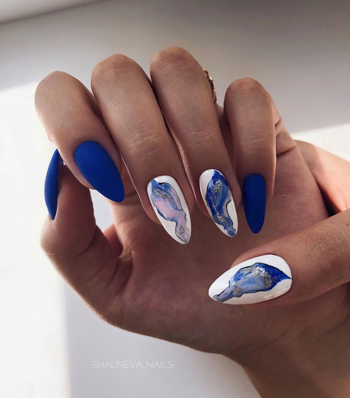 Сочетание синего и белого цвета сегодня считается наиболее распространённым вариантом дизайна. Это просто отличное решение, благодаря которому образ получится весьма интересным и нескучным. Синий оттенок может быть любым, от глубокого тёмного до нежного светлого. Благодаря белому цвету, любые сочетания будут смотреться стильно, свежо и эффектно. Сине-белый вид маникюра часто называют морским или используют этот дуэт для создания зимнего дизайна. Вы можете нанести белые рисунки на один из оттенков синего, или наоборот, украсить синими изображениями белые ноготки. Также очень красиво смотрится в таком маникюре выделение одним из цветов акцентного пальчика или комбинирование обоих покрытий на одном ноготке.