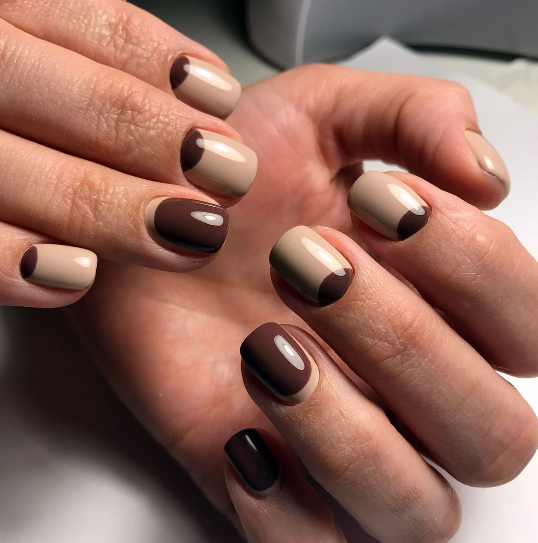 В 2020 году актуальны не только яркие, контрастные сочетания, но и более естественные комбинации оттенков в маникюре. Среди них коричневый и бежевый цвет. Вместе они смотрятся нейтрально, не слишком броско. Поэтому именно такое сочетание стало любимым у многих девушек. Тем более, что этот маникюр на коротких ноготках смотрится просто превосходно. В основном это двухцветное покрытие без лишних деталей. Но при желании нейл-мастер всегда дополнит его легким, ненавязчивым рисунком. Только в таком случае коричнево-бежевый маникюр будет прекрасно смотреться с любым образом. Декор практически не используется, поскольку оформление само по себе выглядит идеально.