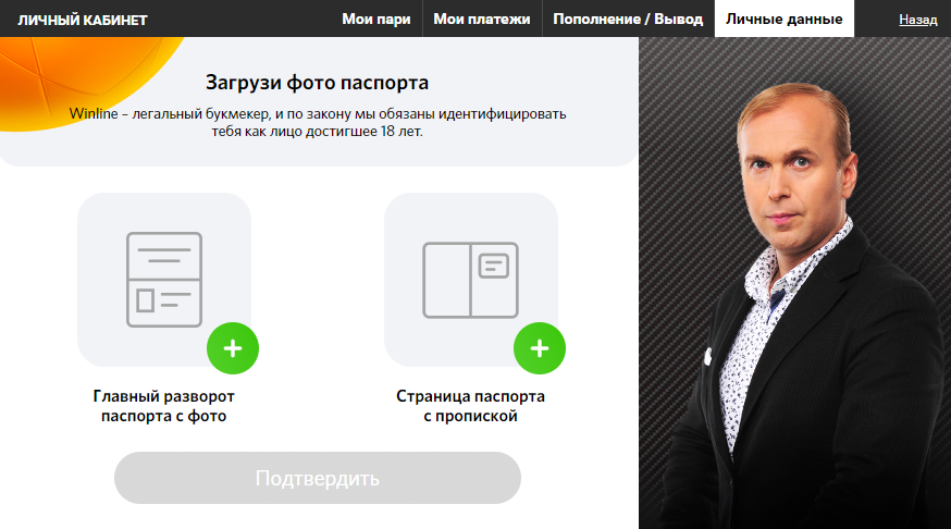 Далее ваш аккаунт нужно будет верифицировать. Поскольку «Винлайн» – легальный букмекер, полностью соблюдающий законодательство РФ, чтобы пройти идентификацию пользователя, нужно перейти в личный кабинет и там загрузить свои документы. Букмекер просит клиентов предоставить фото главного разворота паспорта, страницы с пропиской, ваше фото на фоне паспорта, а также вписать номер своего СНИЛС.