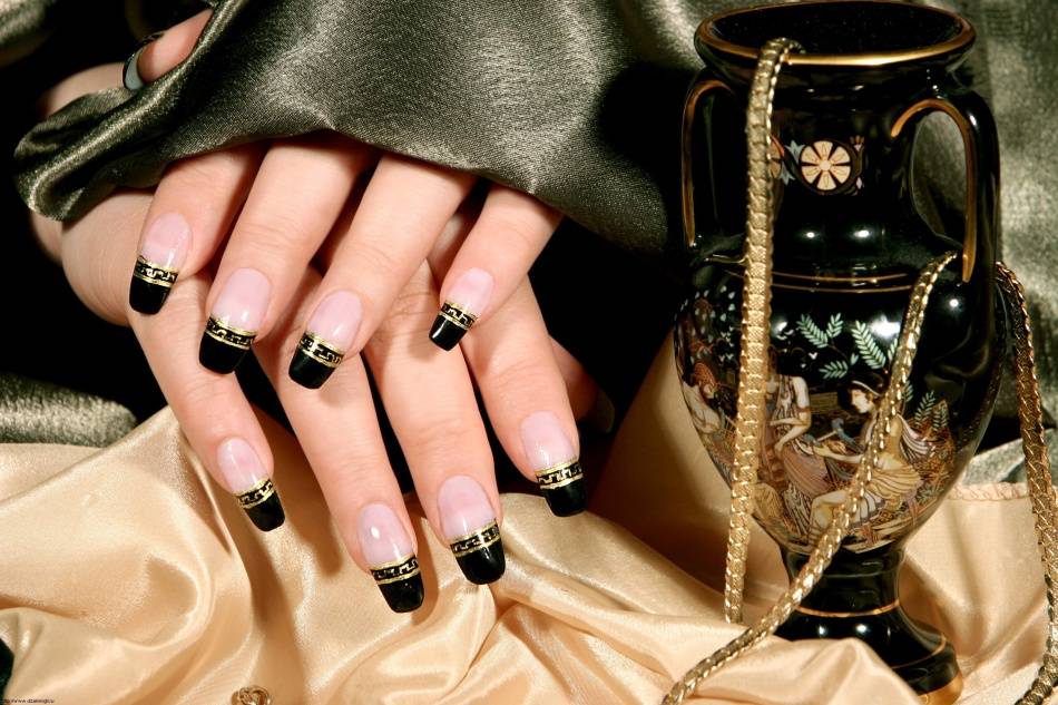 Варианты красивого черно-белого френча с золотом на короткие и длинные ногти