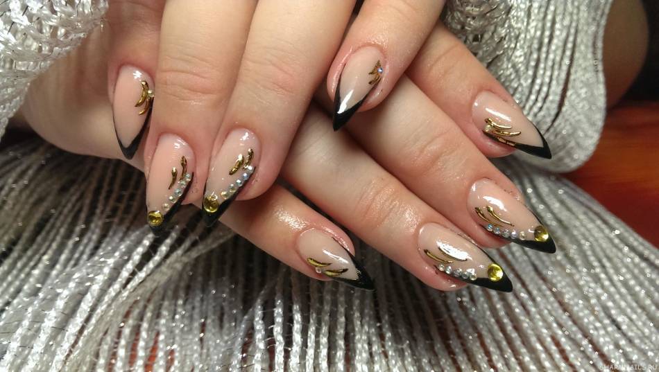 Острые черные «коготки» с декором из белых и золотых кристаллов подчеркнуть стиль и индивидуальность девушки. Нежное сочетание лака и кристаллов создают драгоценный акцент на кончиках пальцев.