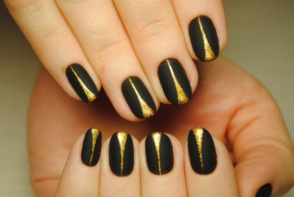 Любите блеск каждый день? Матовый черный маникюр с золотым переливающимся декором в форме вытянутого треугольника отличное решение для современных леди.