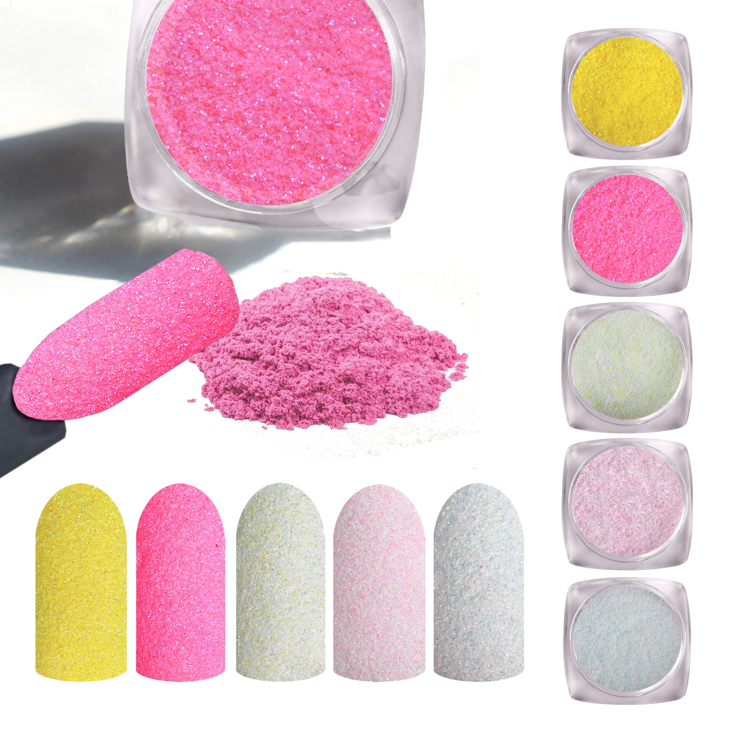 - Используя пудру. В этом варианте накрашенные ноготки опускают в ёмкость со специальным песком либо присыпают их сверху. Пудра имеет несколько видов, отличающихся друг от друга размером крупинок: совсем мелкие придают ногтям вид велюра, а крупные смотрятся как сахарный песок.
