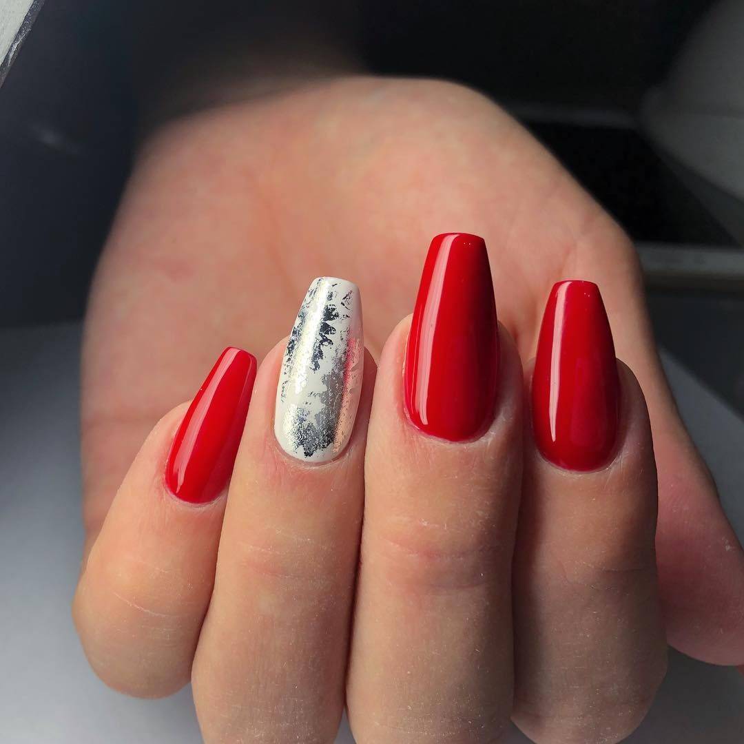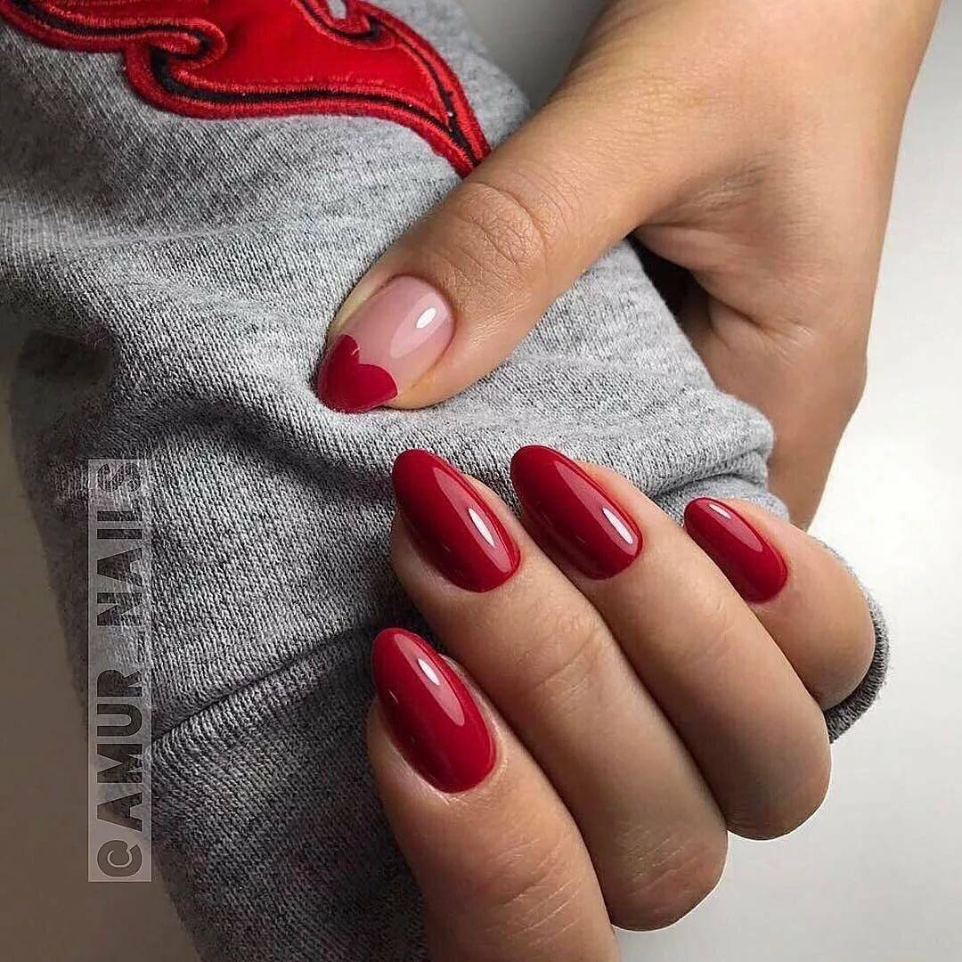 На сегодняшний день одним из самых популярных дизайнов для выполнения маникюра считается стиль минимализм. Такой маникюр — неброский, приятный на вид и абсолютно не надоедает при долгом ношении на ноготках. Красный цвет при выполнении данного дизайна смотрится восхитительно. Очень мило и нежно выглядят арки, которые наносятся по овалу ноготка выполнены красным цветом. При этом основа может быть нюдового, белого или пастельного цвета. Но самым трендовым дизайном в стиле минимализм принято считать однотонную основу прозрачного тона с красными сердечками небольшого размера на одном ноготке.