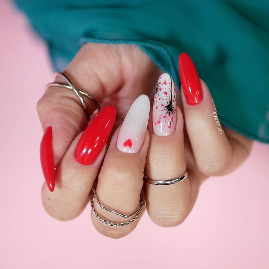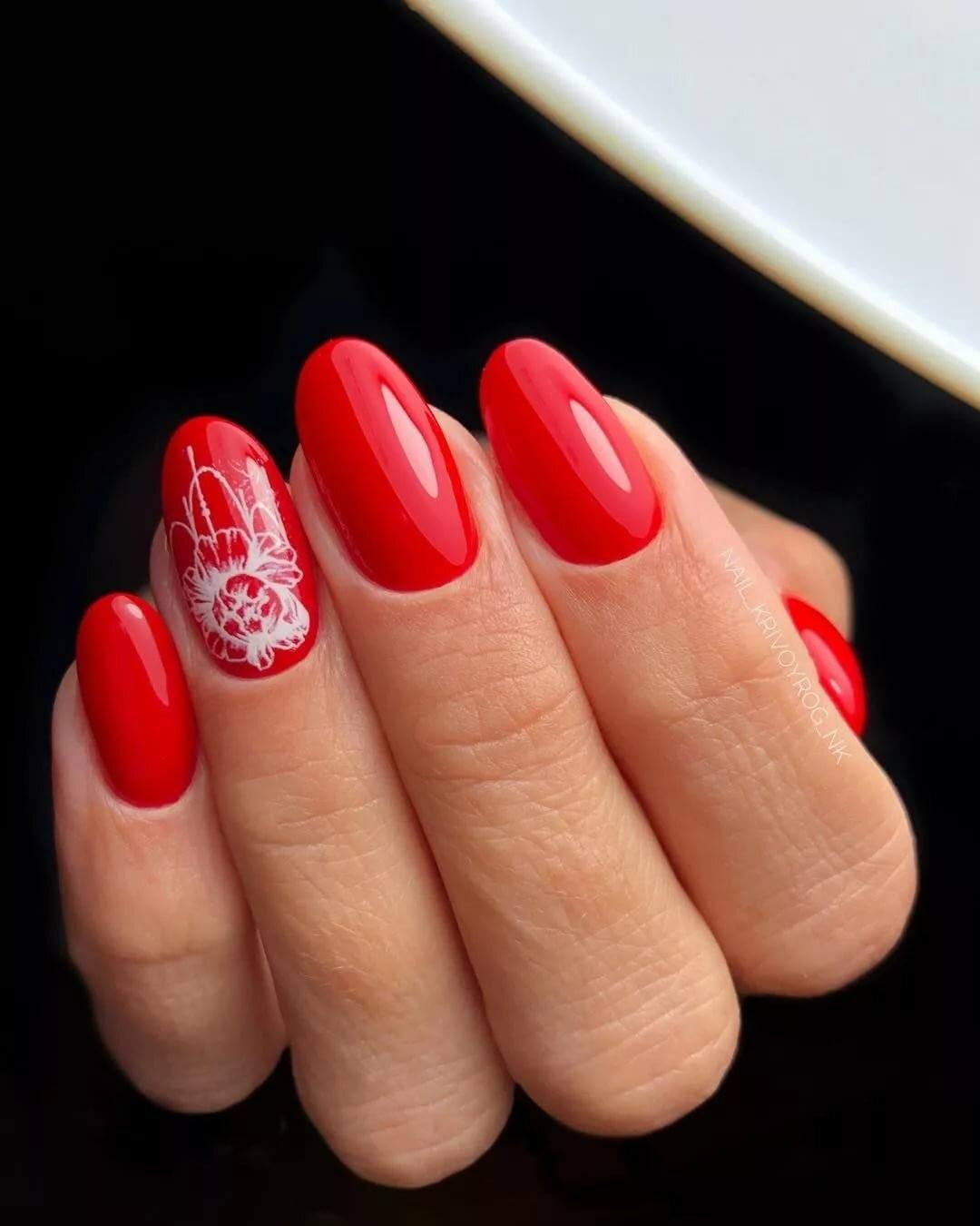 Весной можно разнообразить красный маникюр акцентом в виде белоснежного фона на одном из ногтей и контрастирующей с ним веточкой с красными бутончиками.