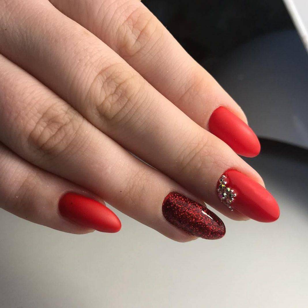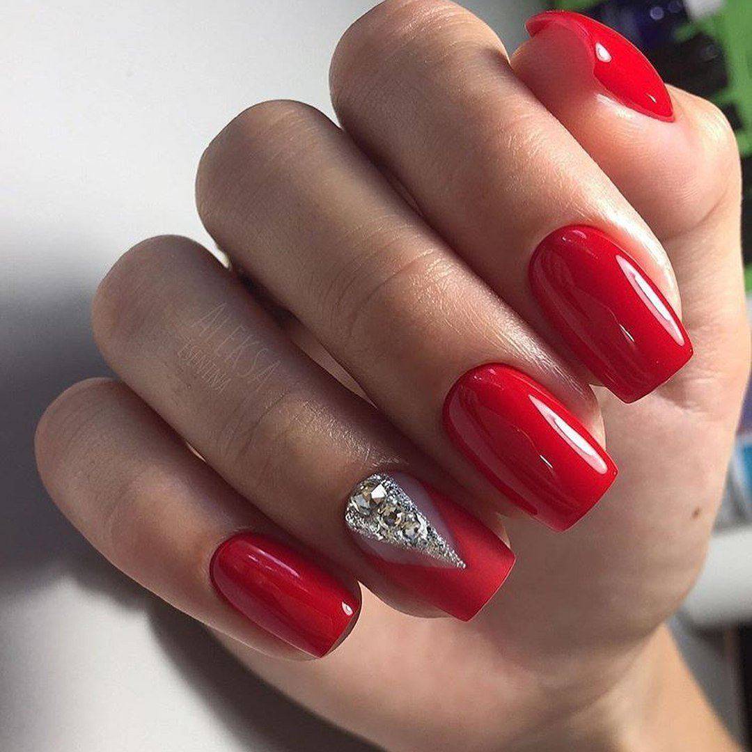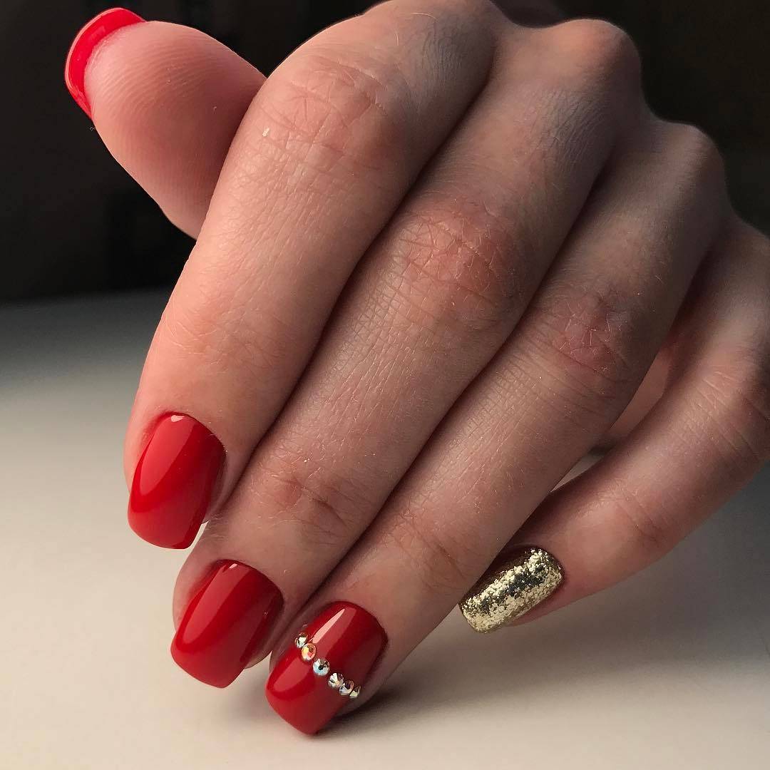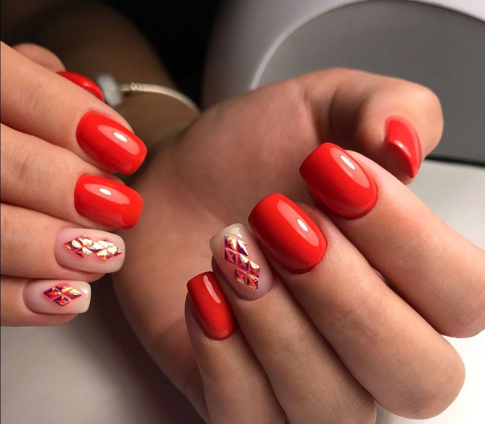 - стразы, камни, бульонки – однотонный красный маникюр в сочетании со стразами выглядит мега-стильно и благородно. Именно такой дизайн ногтей считается универсальным.
