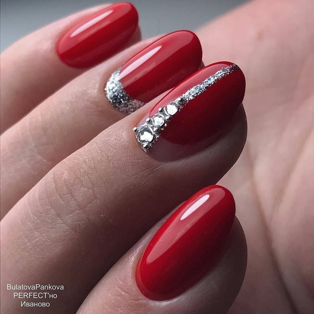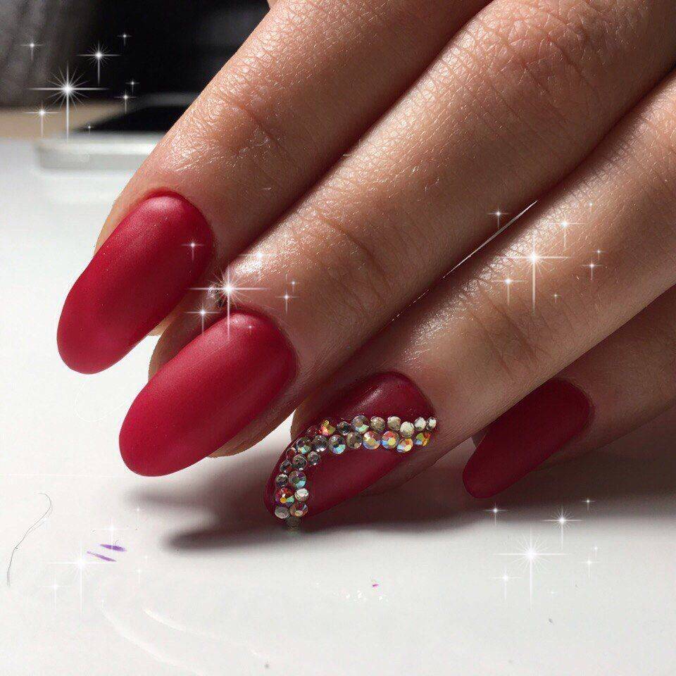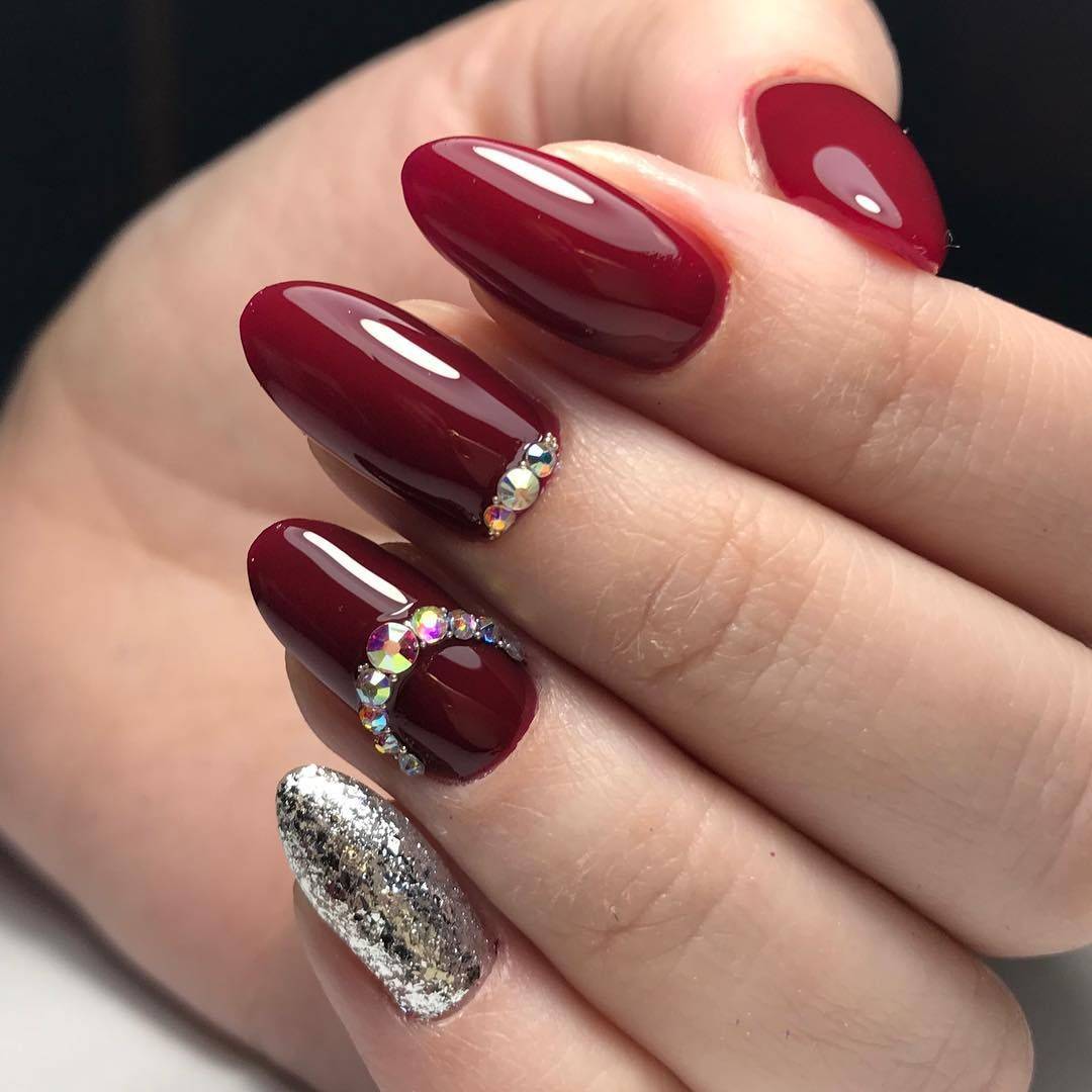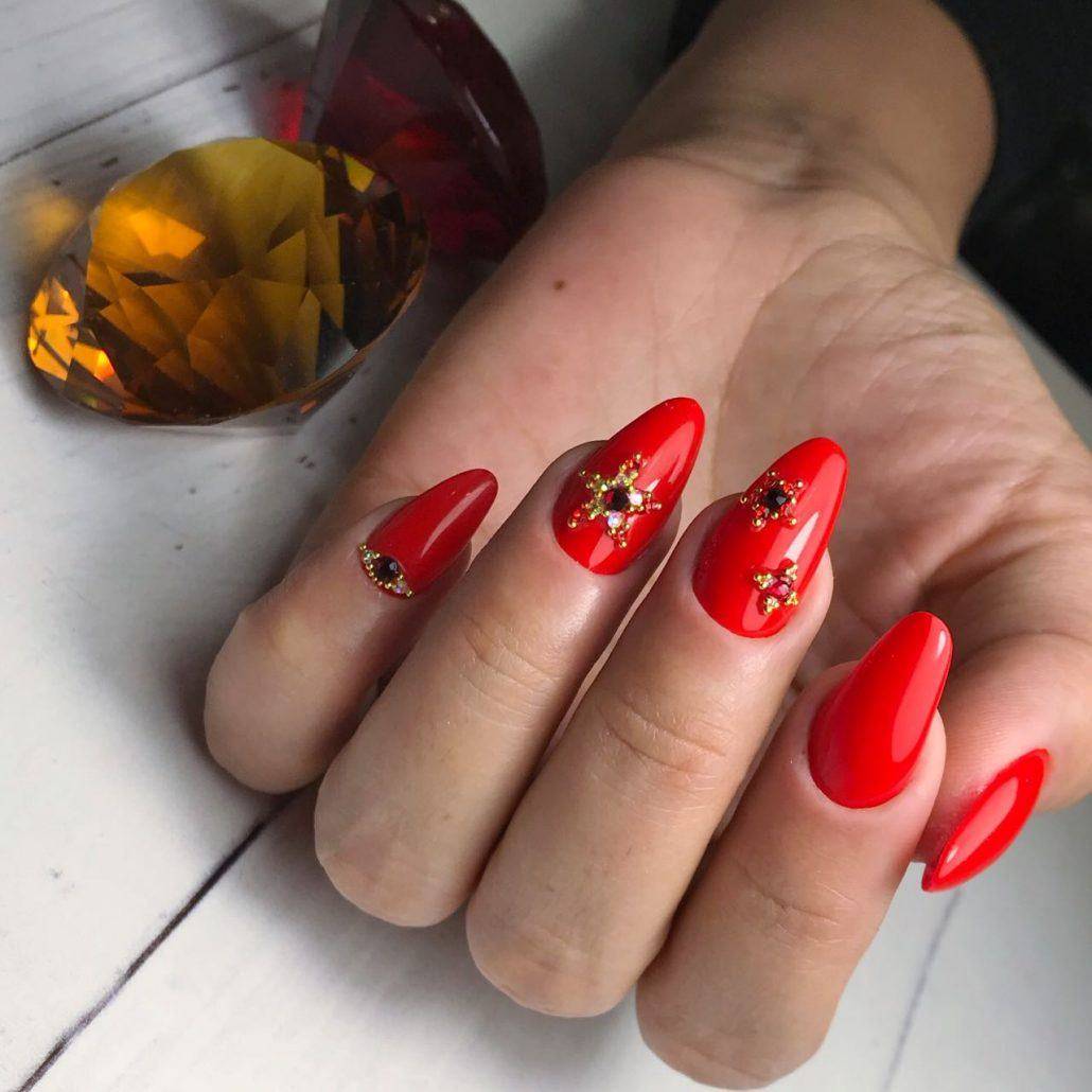 - стразы, камни, бульонки – однотонный красный маникюр в сочетании со стразами выглядит мега-стильно и благородно. Именно такой дизайн ногтей считается универсальным.
