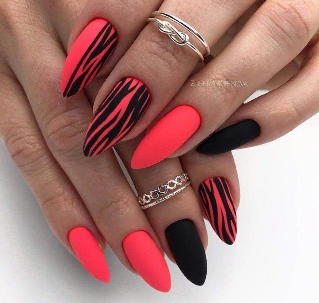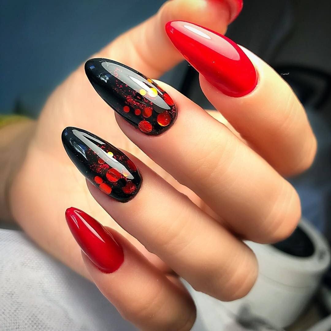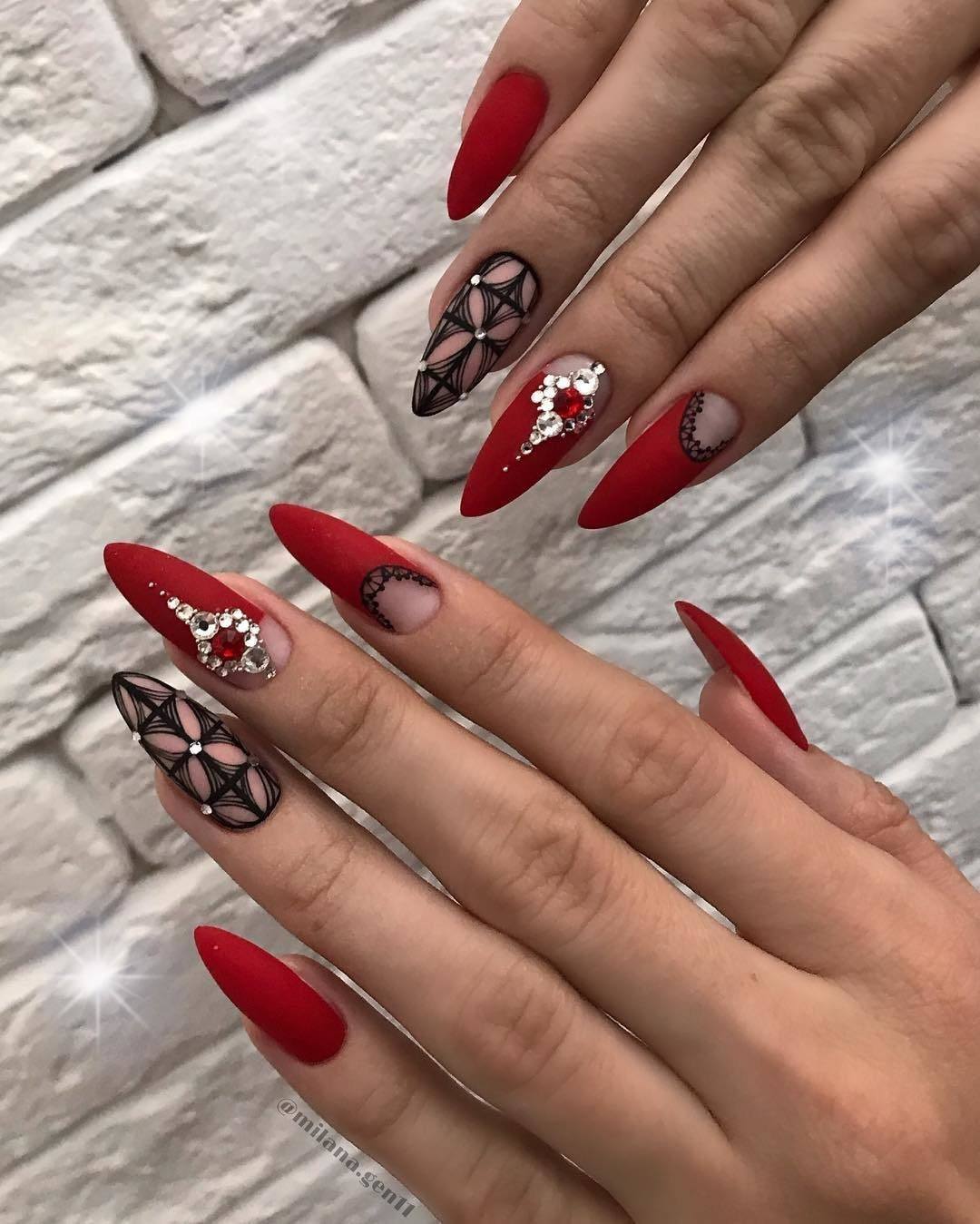 Еще более эффектно за счет контраста выглядит черно-красный маникюр на длинные ногти. Сочетать можно не только гель-лаки красного и черного цвета, но и декор в этих тонах. Красные ноготки будут еще выразительнее с черным рисунком или стразами. Обладательницам длинных ногтей не стоит бояться черного декора, имеющего способность «съедать» длину. На фото ниже дизайн в смелых красно-черных сочетаниях.