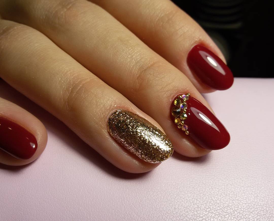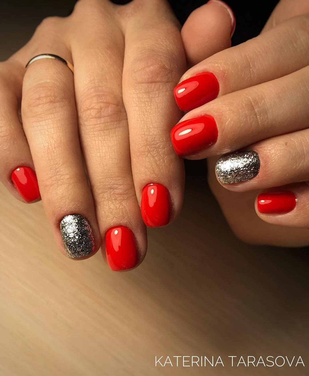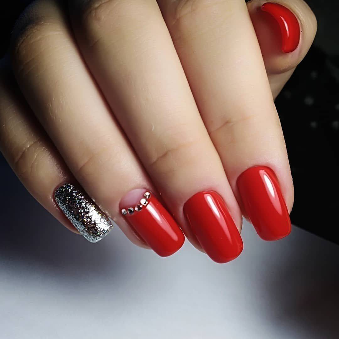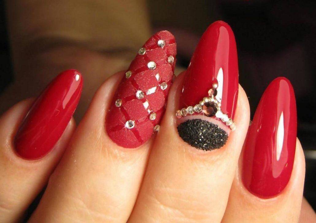 Для красного дизайна ногтей выбирайте не только классические серебряные стразы, то и золотые, красные, черные, прозрачные. Что касается блесток, то их лучше расположить сплошным слоем на одном из ноготков. Множество примеров маникюра с блестками и стразами вы найдете в фото-подборке в конце обзора.