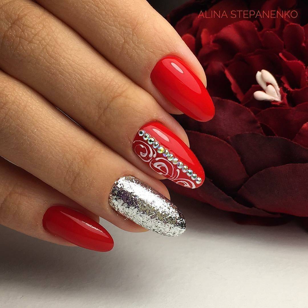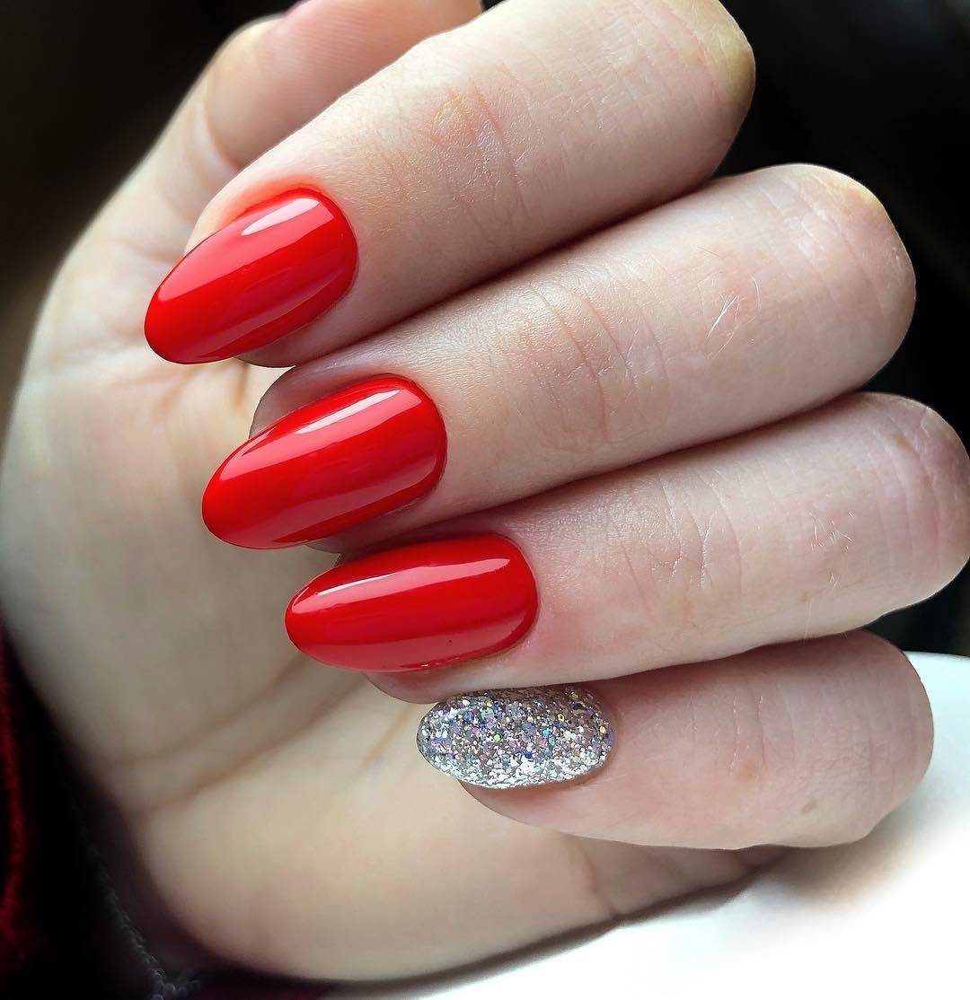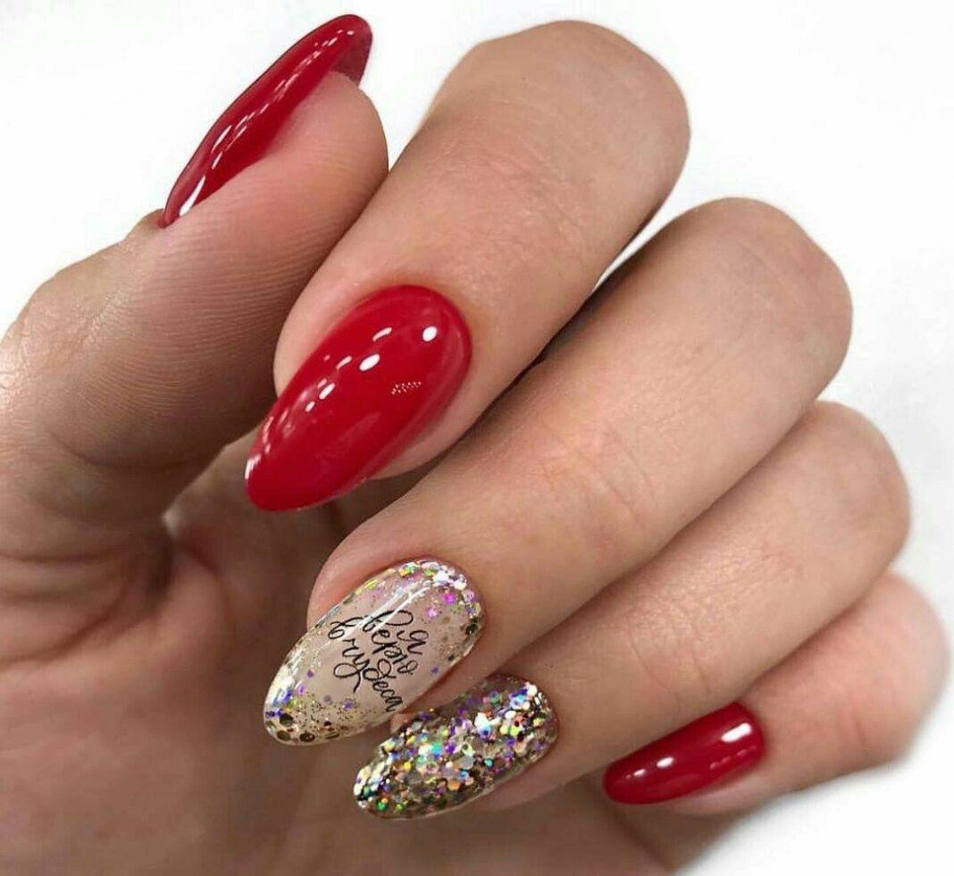 Для красного дизайна ногтей выбирайте не только классические серебряные стразы, то и золотые, красные, черные, прозрачные. Что касается блесток, то их лучше расположить сплошным слоем на одном из ноготков. Множество примеров маникюра с блестками и стразами вы найдете в фото-подборке в конце обзора.
