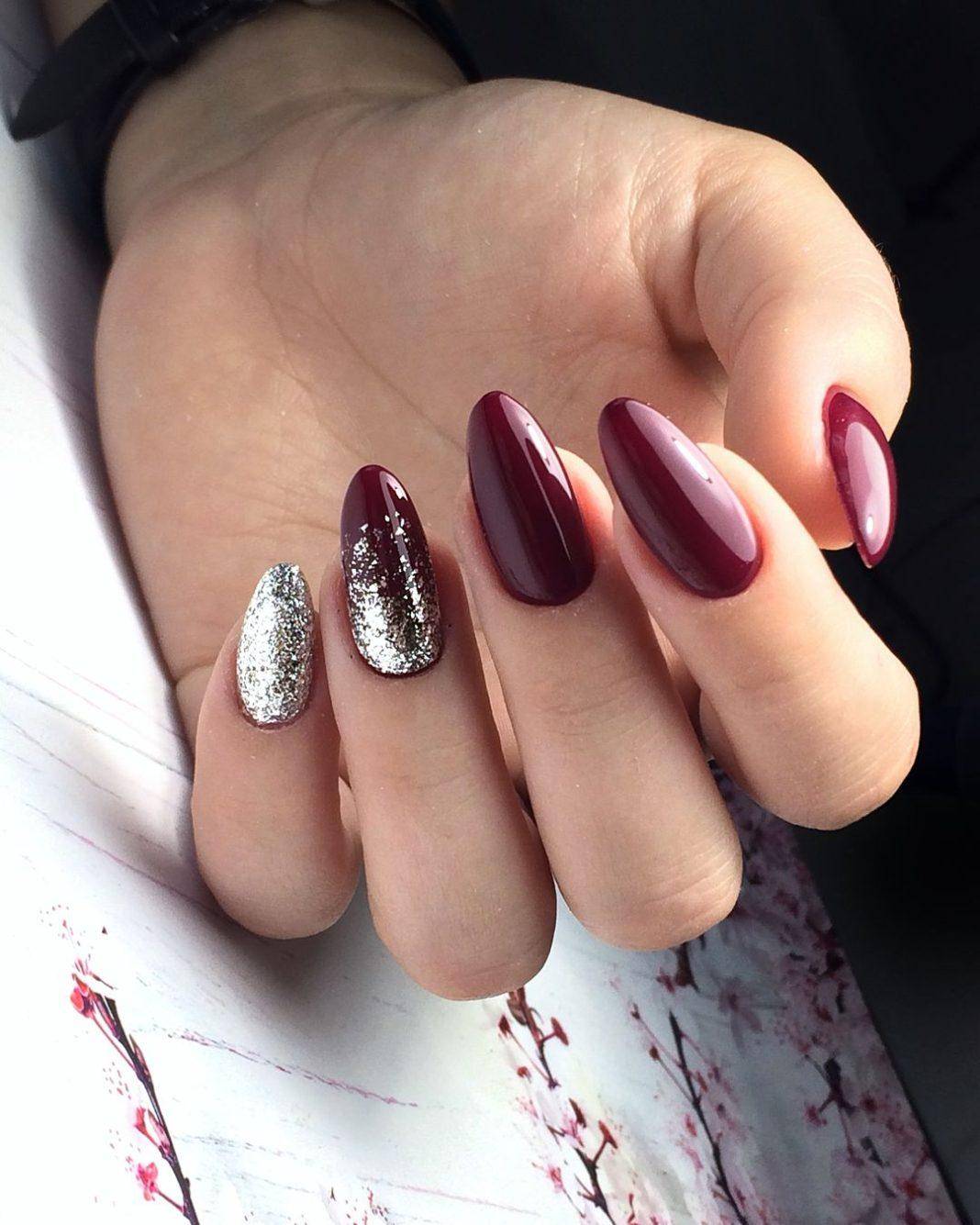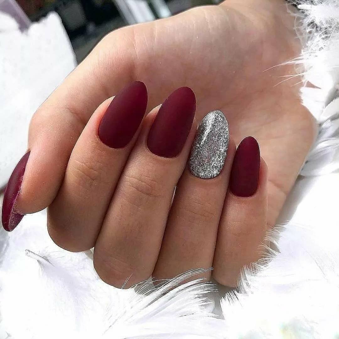 Темный оттенок лака прекрасно подчеркнет красоту длинных ногтей. На длинных ногтях стильно будет смотреться любой дизайн и фактура топа. Один-два пальца можно выделить лаком другой текстуры, стразами или другим цветом.