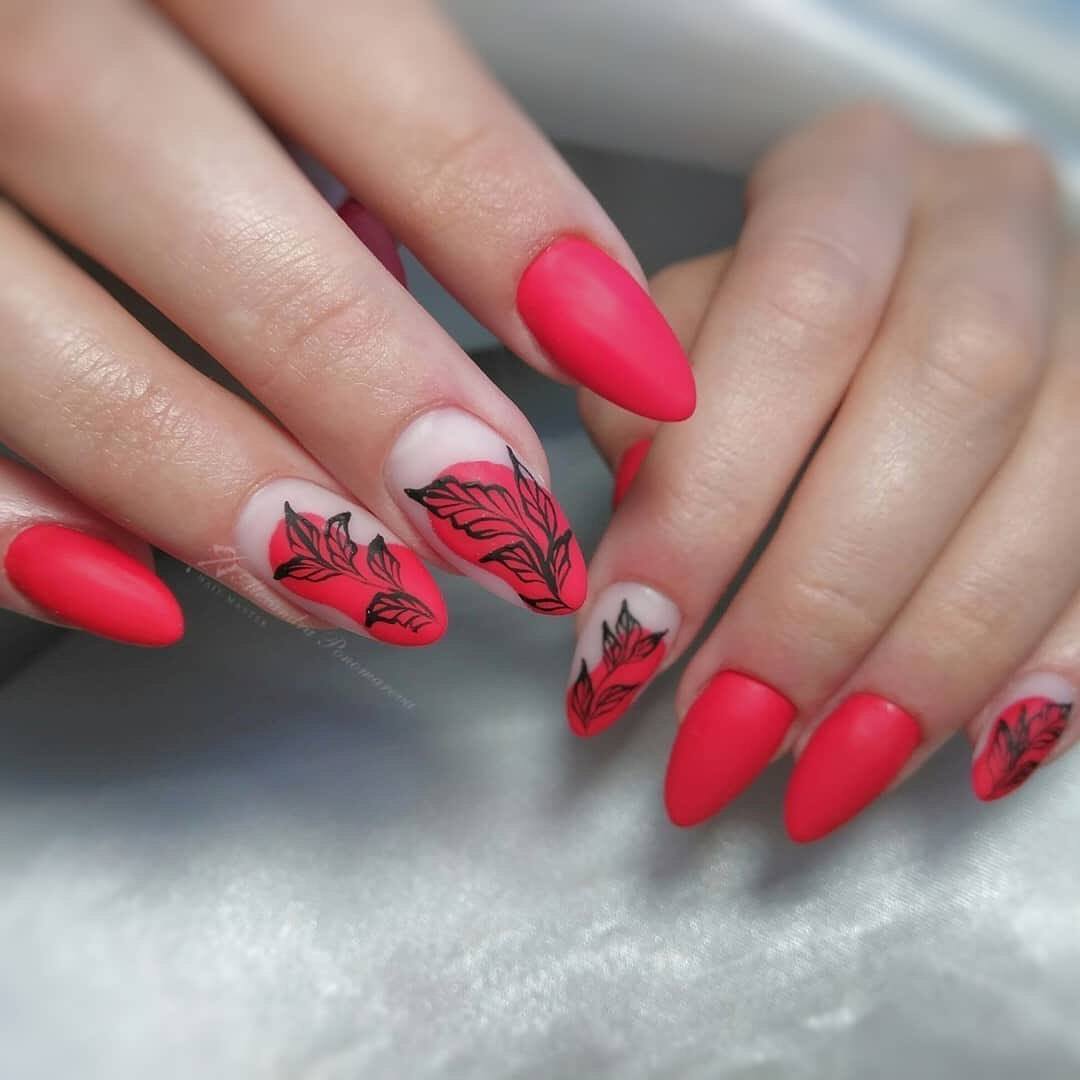 Если ноготки очень короткие, лучше выбирать яркие красные оттенки с оранжевым подтоном, они визуально вытягивают ногтевую пластину. Если дизайн ногтей красный с черным, второй оттенок нужно использовать по минимуму, например, для прорисовки узоров или контуров. Покрытие коротеньких ноготков черным гель-лаком сделает их еще миниатюрнее.