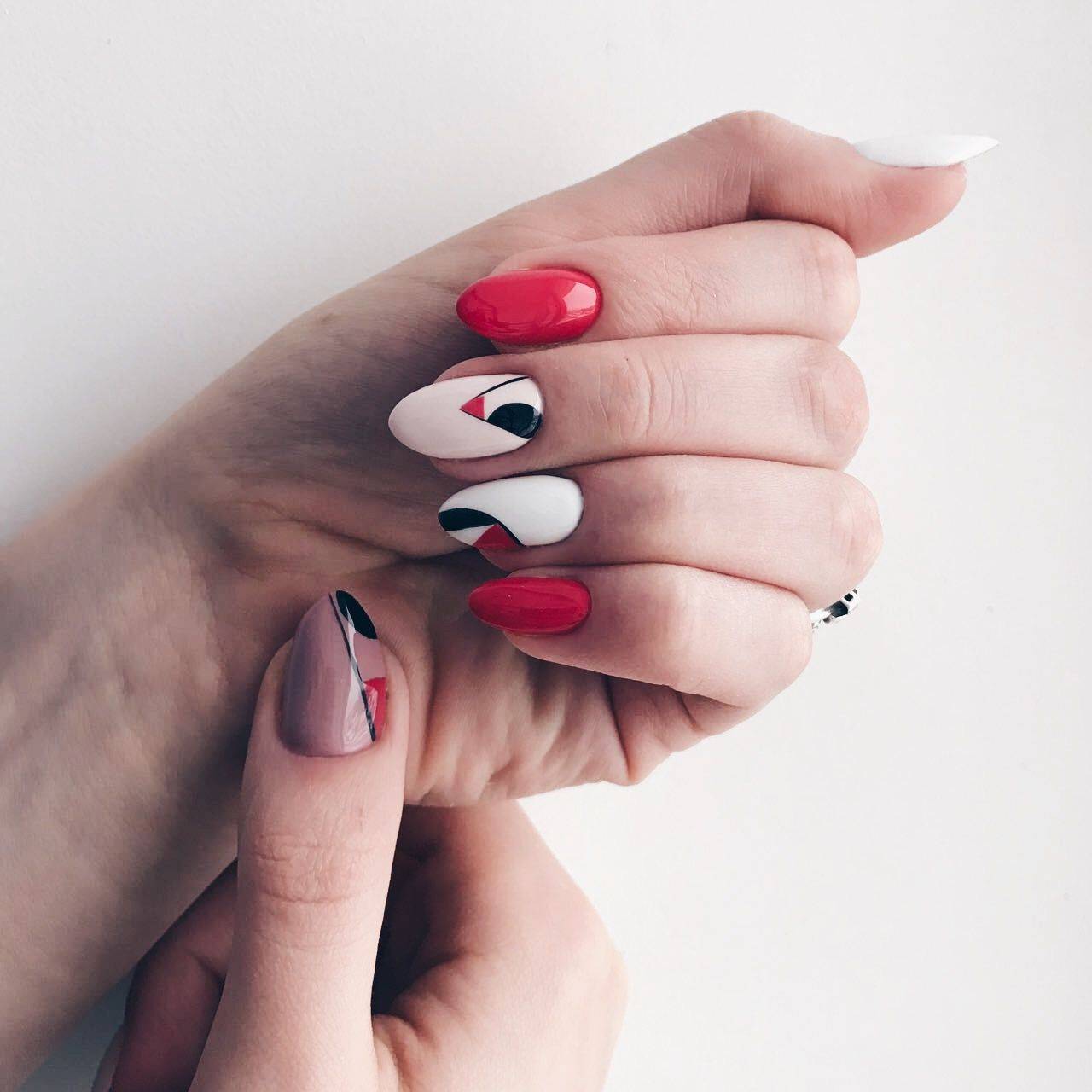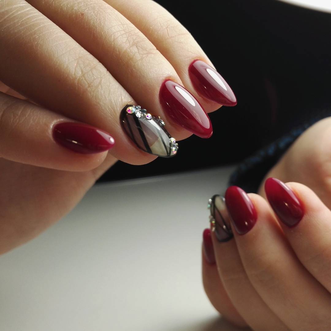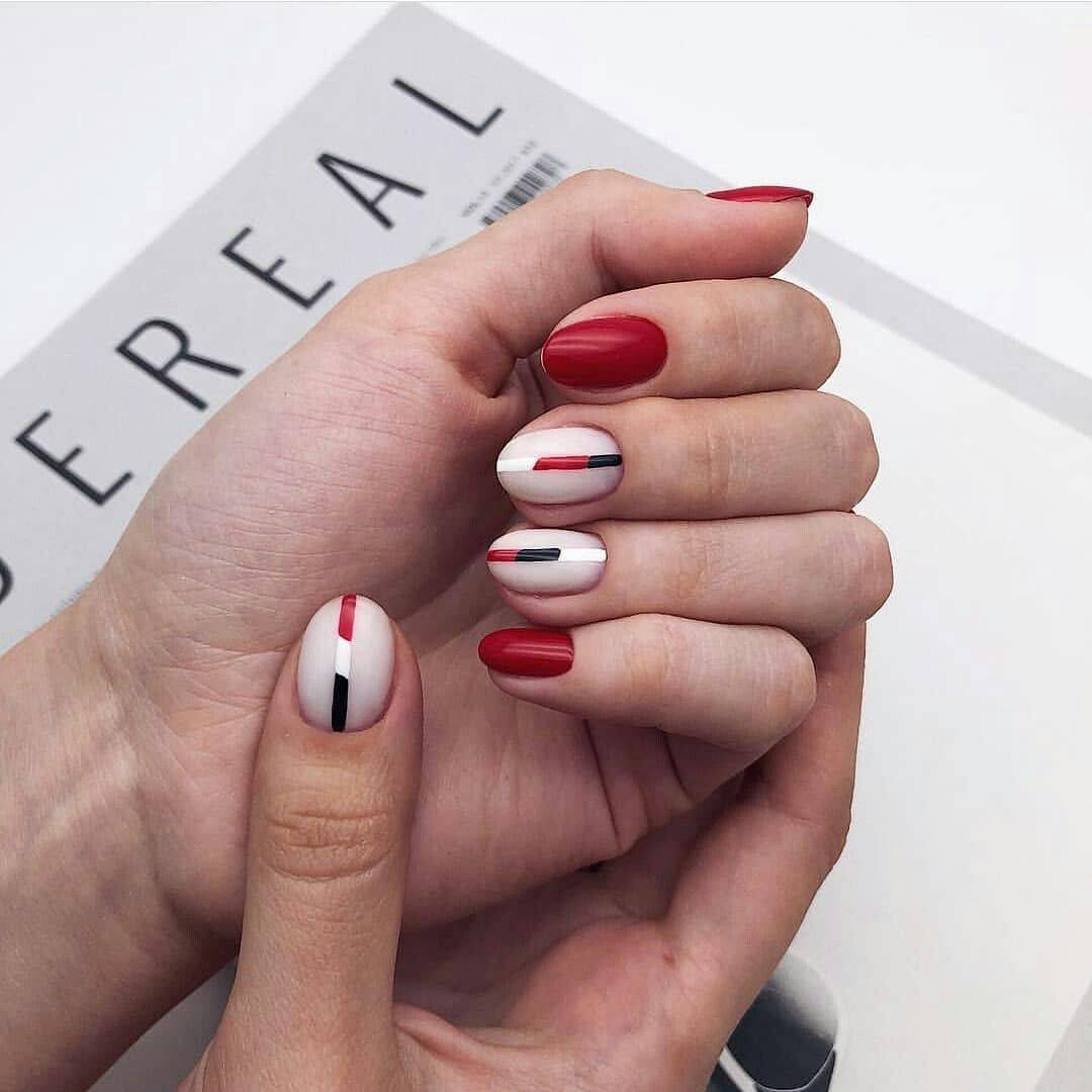 - геометрия – такой сдержанный цвет как красный и его многочисленные оттенки нуждаются в строгих и лаконичных узорах. Геометрия в белом, черном и других оттенках станет лучшим дополнением алого, бордового, вишневого маникюра.