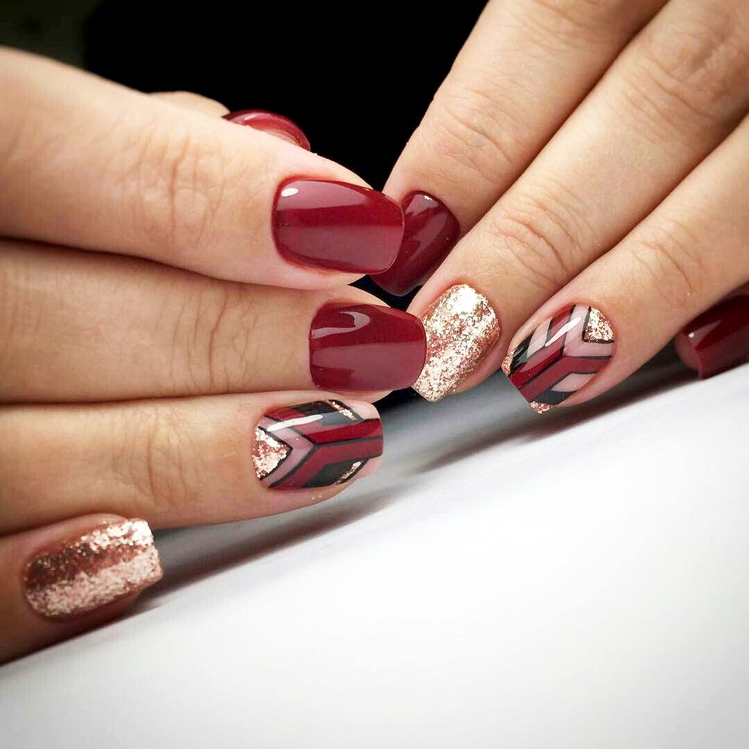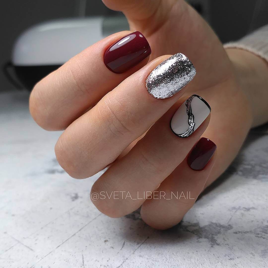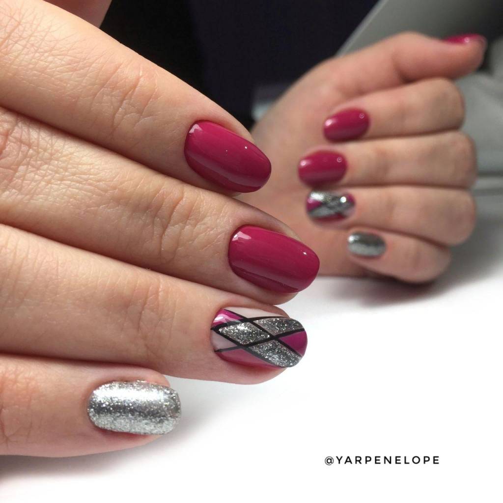 - геометрия – такой сдержанный цвет как красный и его многочисленные оттенки нуждаются в строгих и лаконичных узорах. Геометрия в белом, черном и других оттенках станет лучшим дополнением алого, бордового, вишневого маникюра.