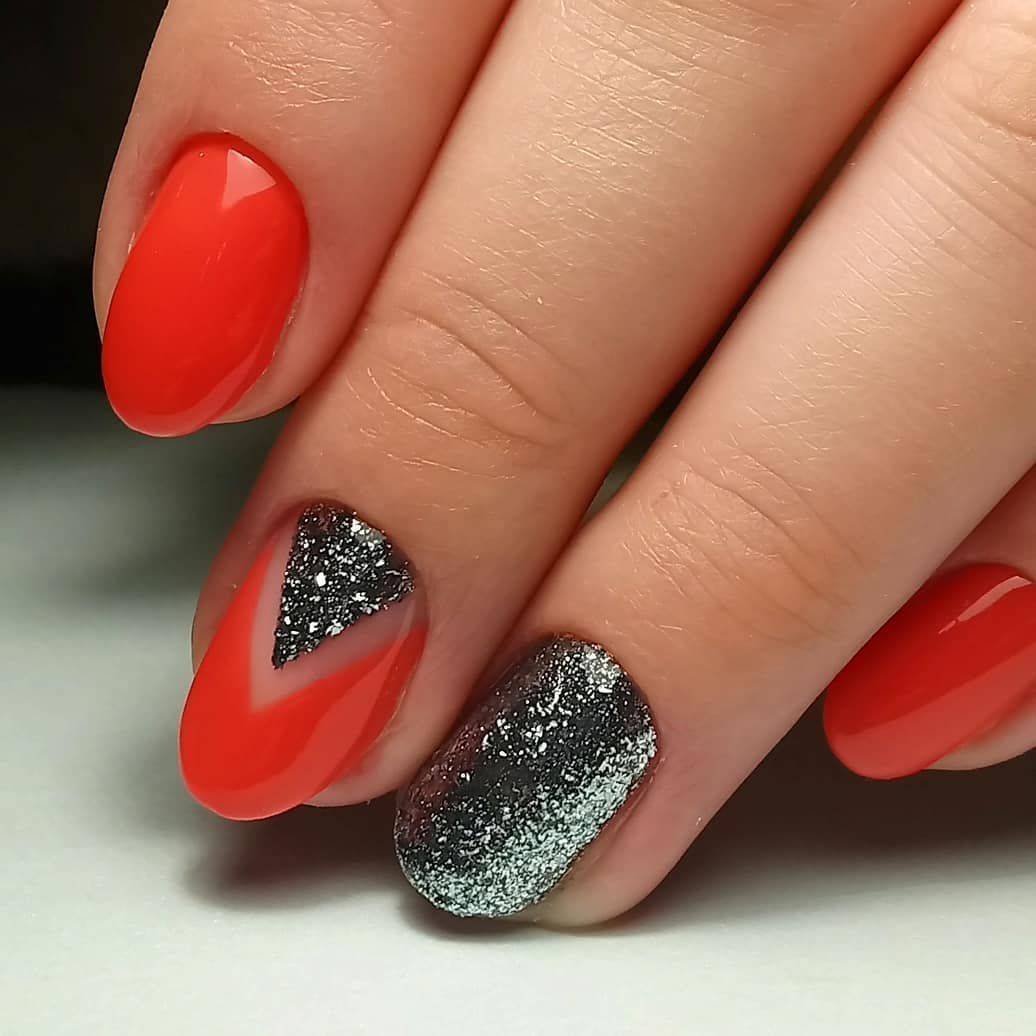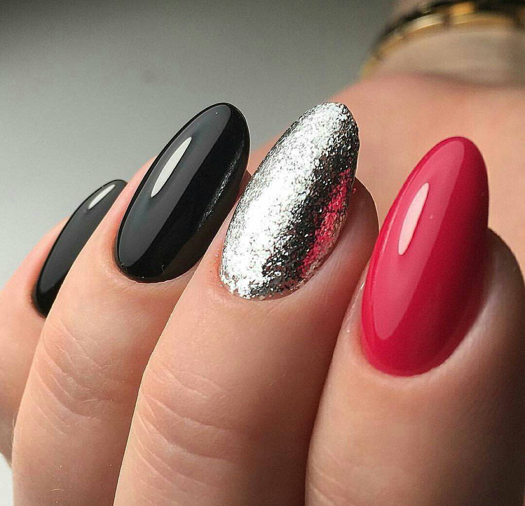 Оригинальные идеи френча с блёстками, красным и чёрным лаком