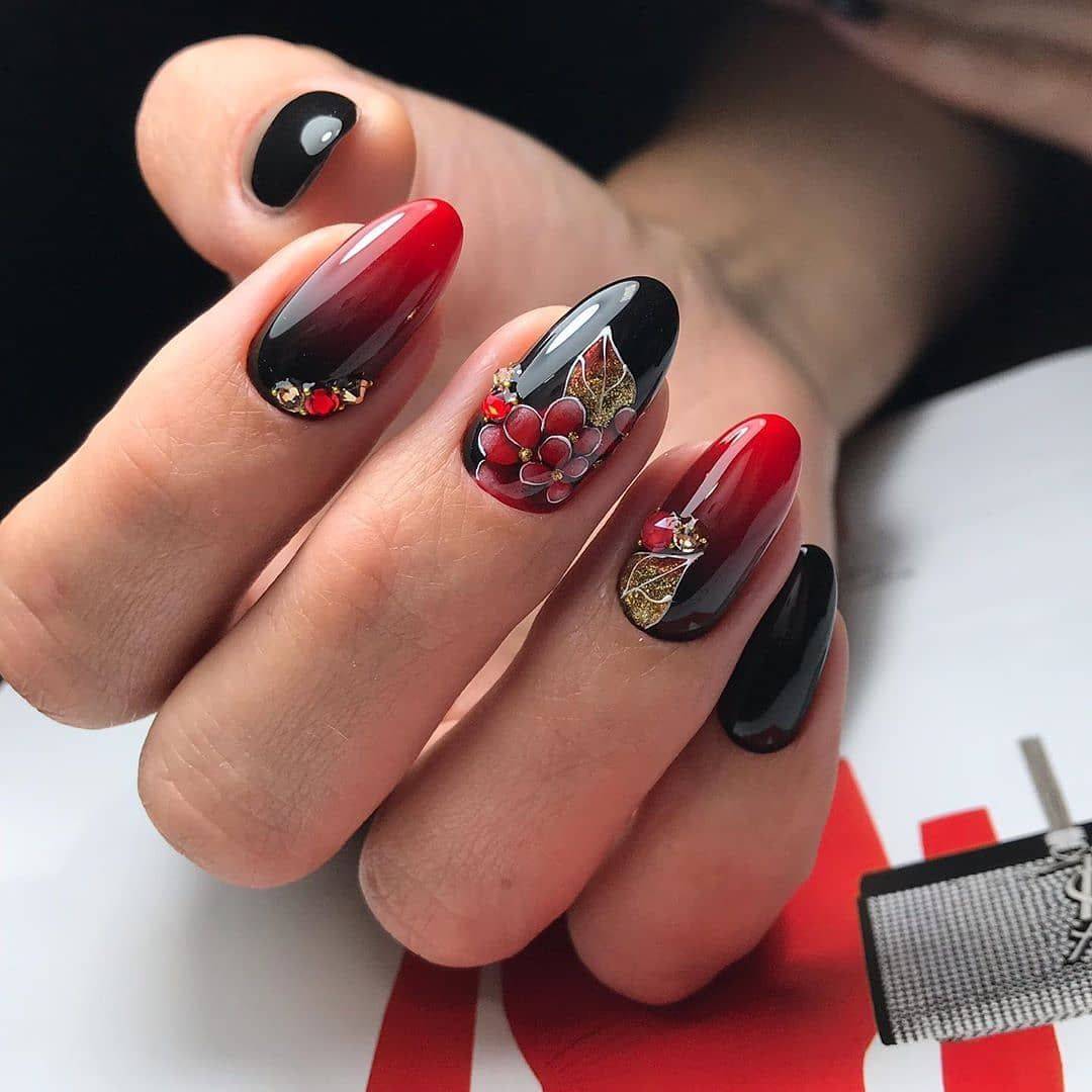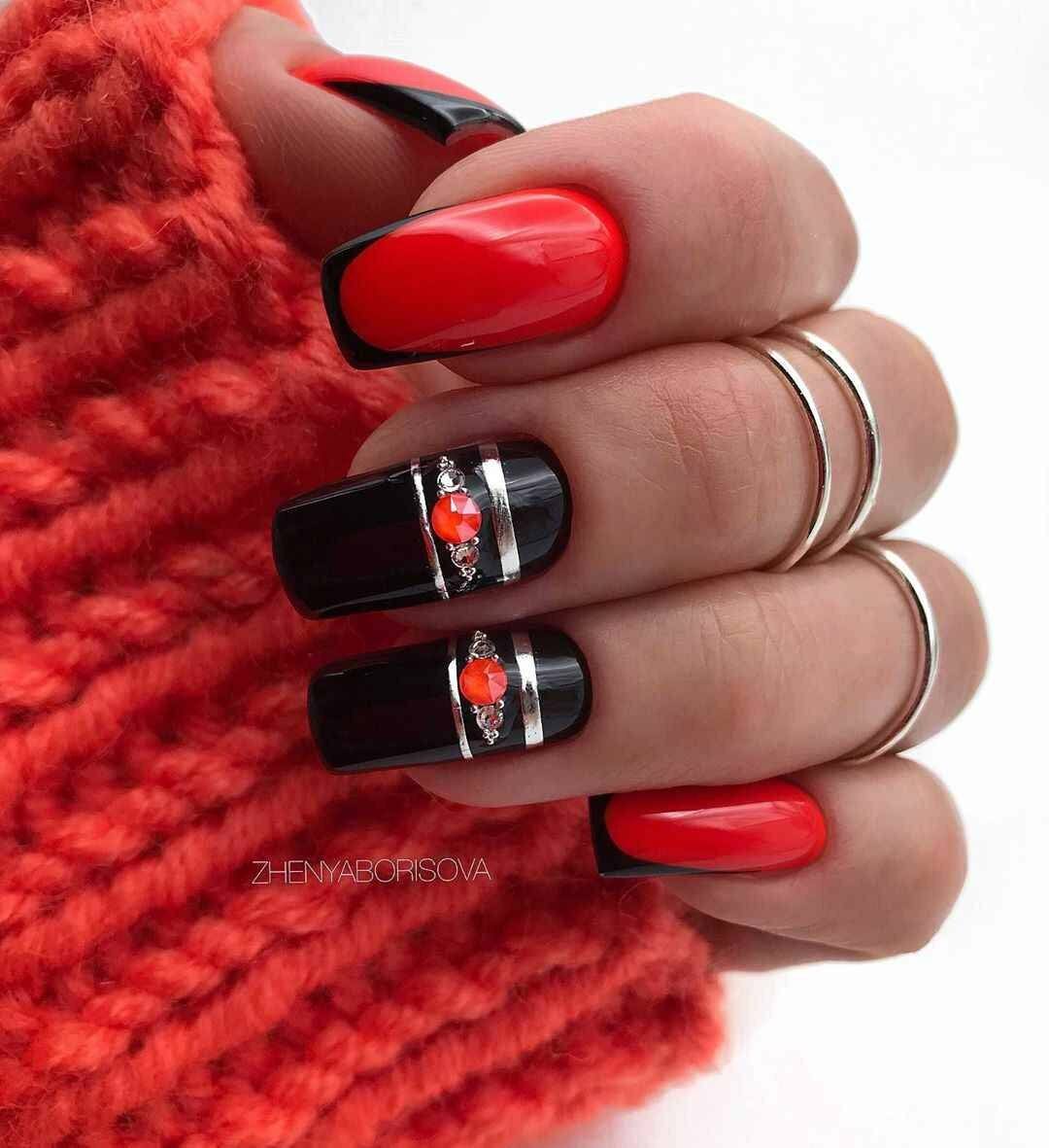В оформлении ногтей часто используется сочетание оттенков, что позволяет создавать гораздо больше вариантов дизайна. В данном случае, красно-черный маникюр уже считается классикой, независимо от выбранного рисунка. Среди самых популярных вариантов можно выделить френч, лунный дизайн, абстракцию и многое другое. Дополнение в виде страз добавляет маникюру яркости и блеска.