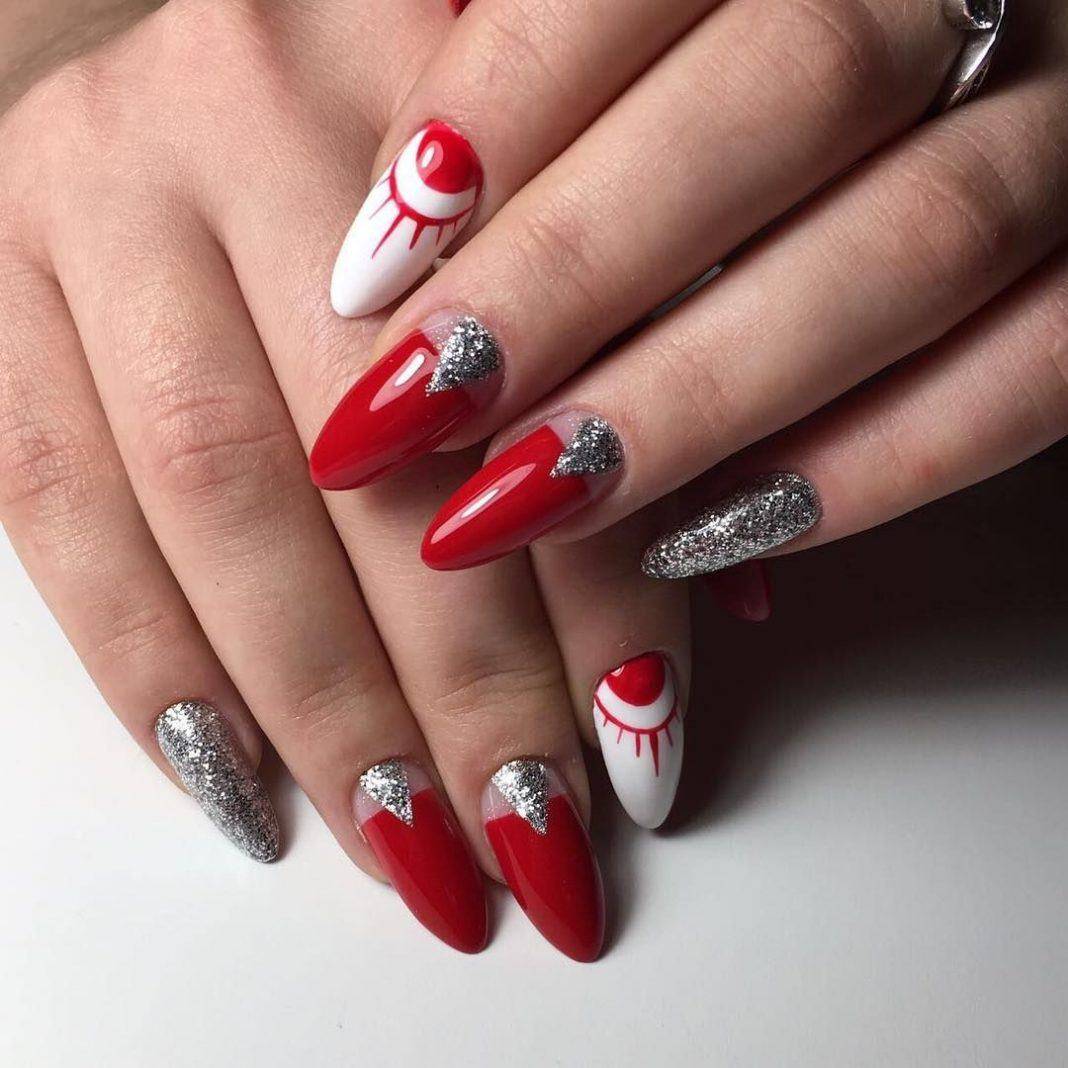 Можно использовать в таком маникюре беспроигрышное сочетание красного с серебристым или золотым, полностью окрасить им лунку или сделать лишь тоненькую дугу.