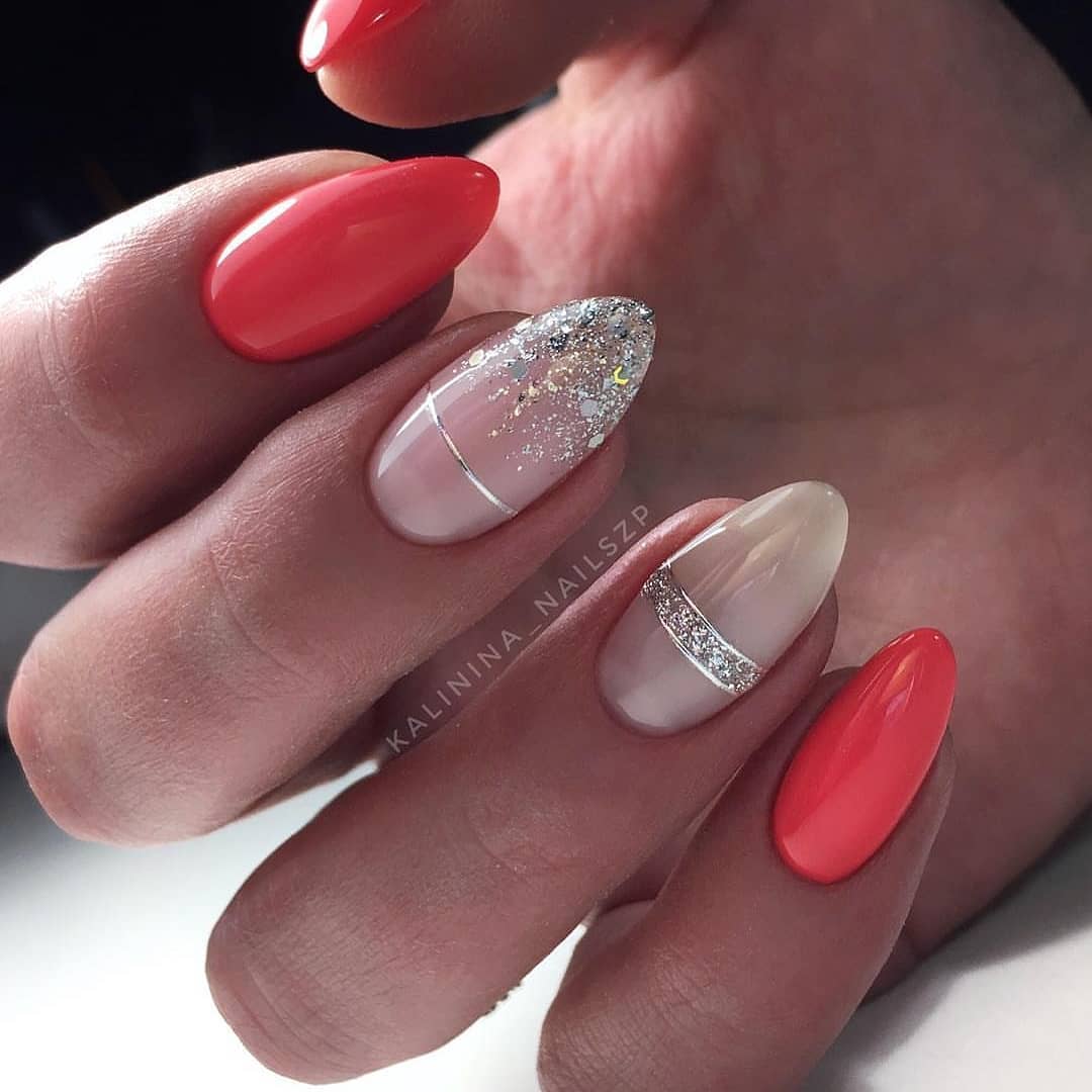 Красные камифубики на прозрачных ногтях добавят игристости вашему образу и украсят кончики ноготков миндалевидной формы. Особенно хорошо такой дизайн ногтей подойдет молоденьким девушкам, которые любят оригинальность и стремятся всегда быть в фокусе.