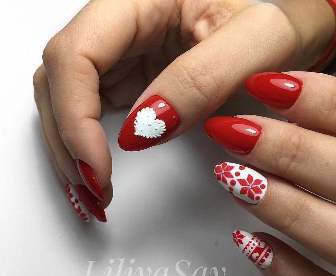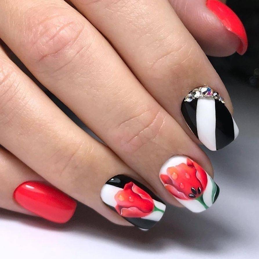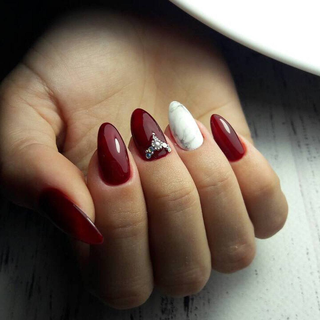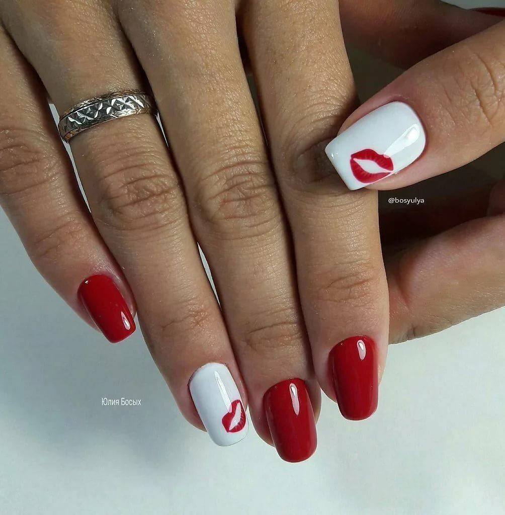 Данное цветовое сочетание выглядит более нежно, поэтому пользуется популярностью круглый год. Его выбирают для самых разных случаев, начиная с романтического свидания и заканчивая свадьбой. Нередко в красно-белом сочетании можно увидеть абстрактный, геометрический, цветочный маникюр. Каждый из них смотрится невероятно красиво, особенно если украсить небольшим количеством страз.