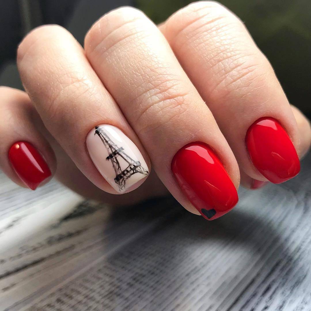 Короткие ногти позволяют создавать красивый маникюр в двух цветах. С красным цветом хорошо сочетаются белый, бежевый, серый, нежно-голубой, розовый и черный.