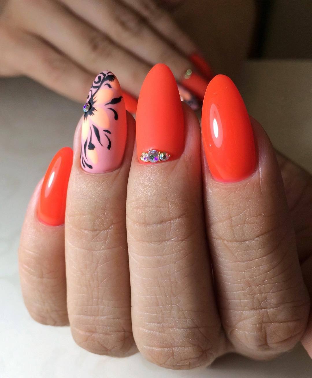 На пике популярности находится удлиненный миндаль и заостренная форма ногтей, предполагающая максимальную длину