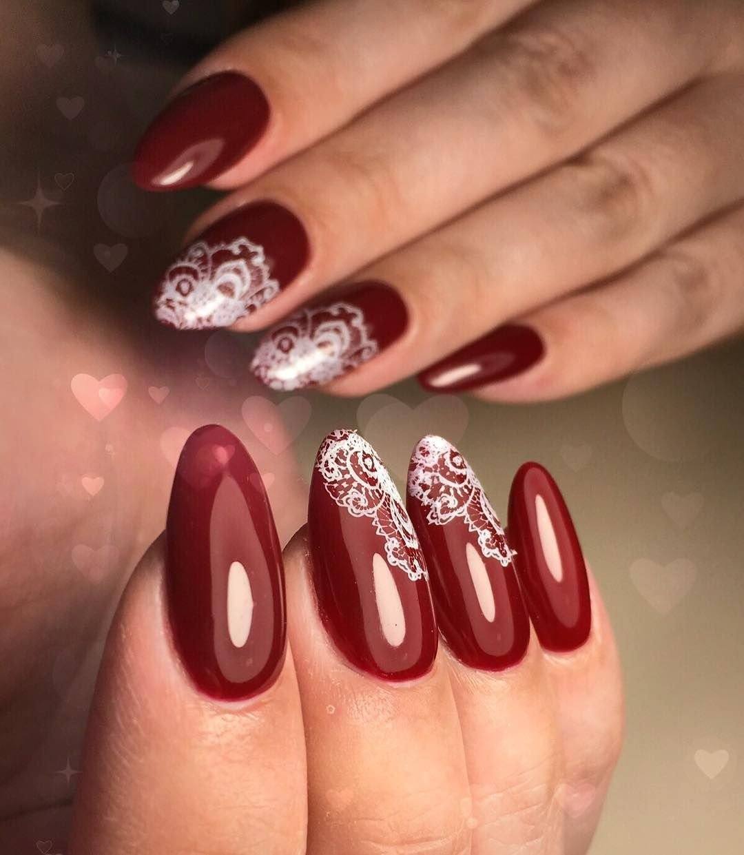 Белым можно сделать лишь несколько неброских акцентов, а иногда и выбрать его как фон для красивого рисунка. Нежным и утончённым маникюр сделают белоснежные вензеля на алом фоне.