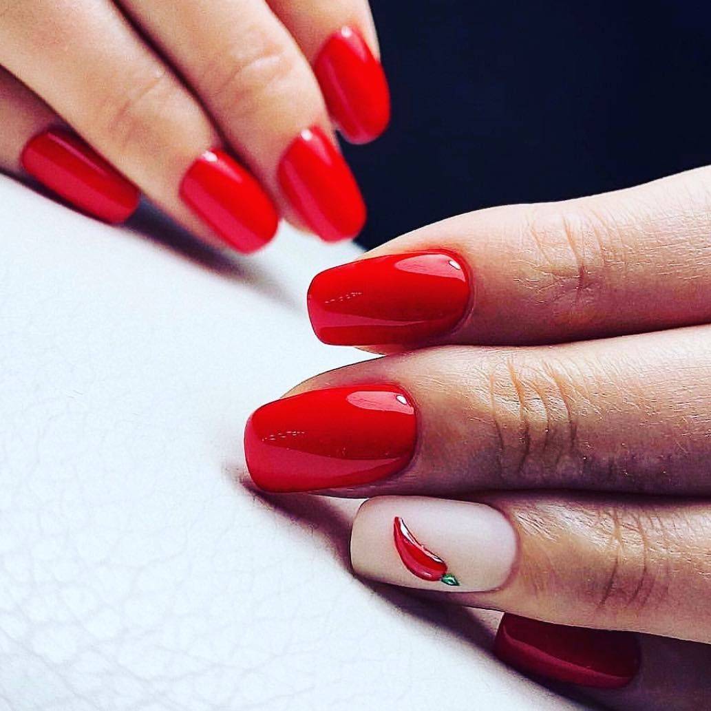 В предстоящем сезоне основной упор в дизайне ногтей будет направлен на лаконичность, простоту и элегантность. Поэтому при создании красного маникюра предпочтительнее делать однотонное покрытие. При этом рисункам, блеску и стразам лучше оставить возможность красоваться на нескольких выделяемых ноготках.