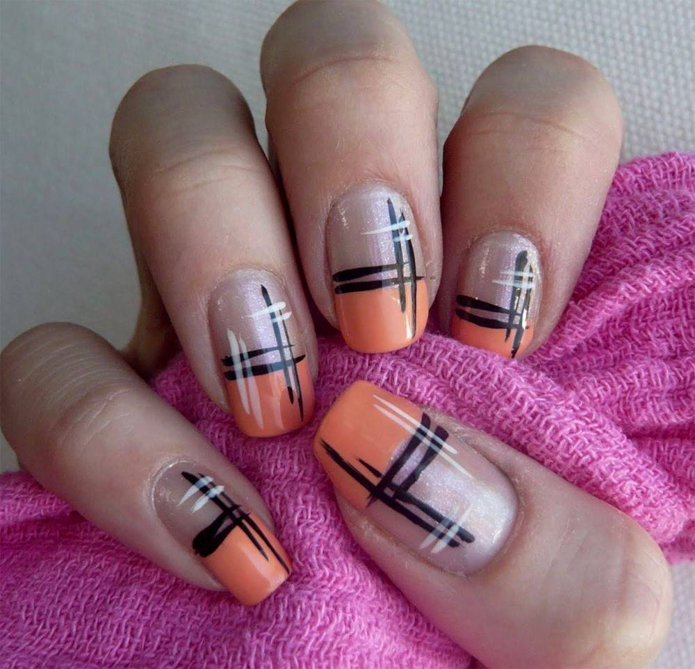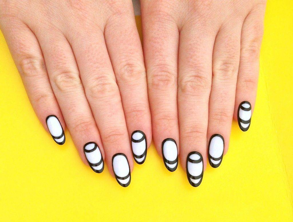 На высохшую подложку белого цвета наносят черные линии тонкой кисточкой. Есть лаки для дизайна, у них как раз такие кисточки.