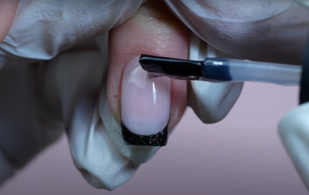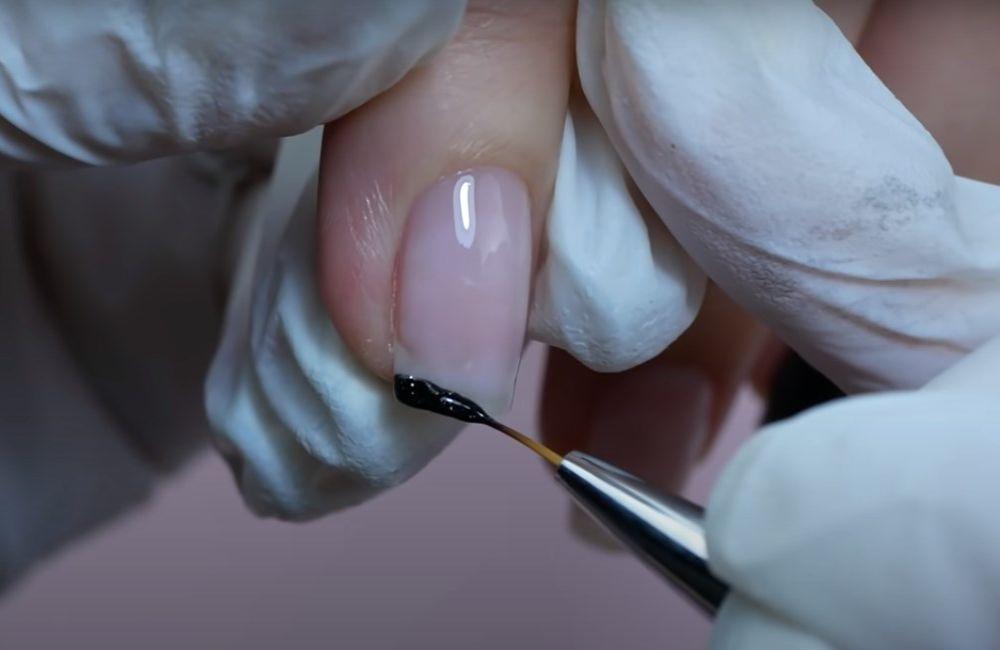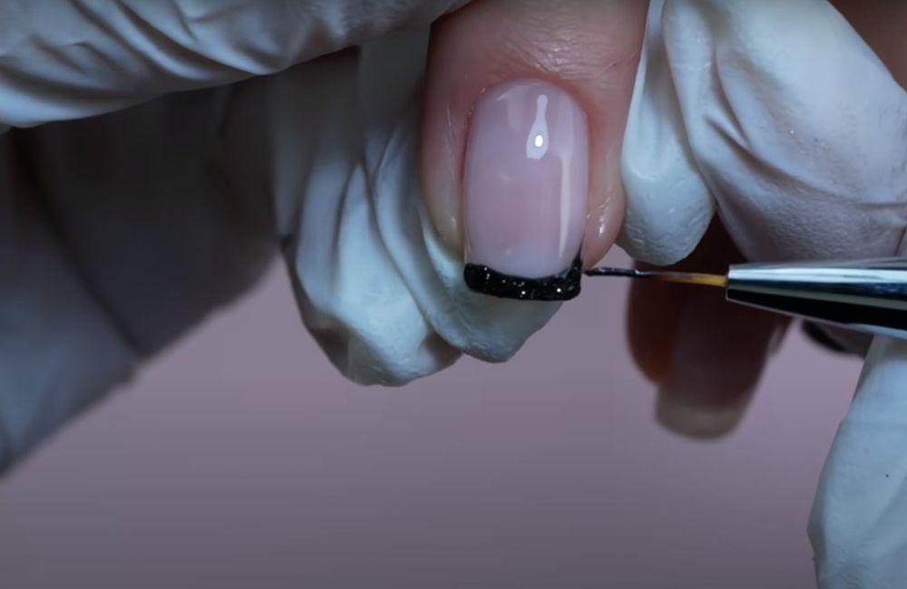 Этап 3 – Кайма. Прорисовывают линию на кончике чёрным гель-лаком, придавая форму. Тонкой кистью делают красивую улыбку.