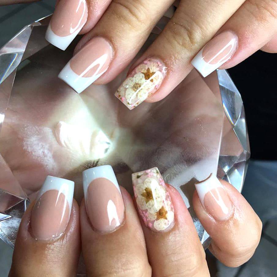 Французский маникюр – ногти средней длины в форме мягкого квадрата, покрытые базовой основой естественного оттенка: розового, бежевого, молочного. На кончике пластины белым цветов выводится «улыбка». Такой способ выглядит натурально, эстетично, подчеркивает изящность и женственность. Френч – это классика, подходящая под любой стиль, но не способная удивлять.