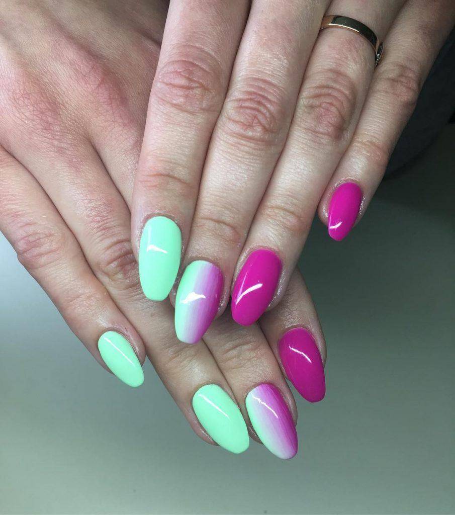 Яркий летний дизайн получится, если с помощью пастельных оттенков (бледно-голубого, нежно-желтого и светлого розового) выполнить технику линейного омбре. Такой градиент будет шикарен также в стиле классического омбре.