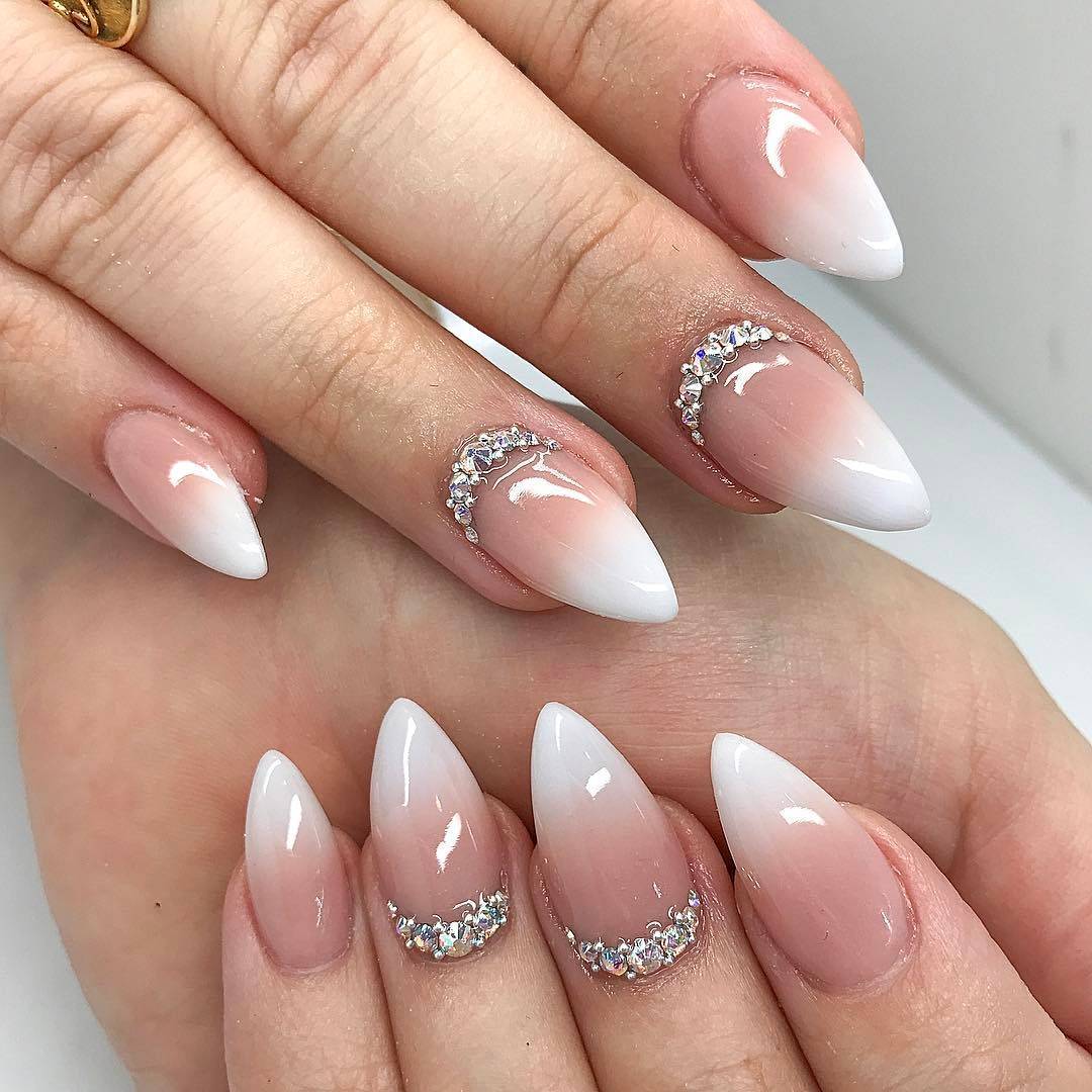 В тренде остался классический френч с добавлением узоров белого цвета или камней. Многие считают, что настоящий френч должен быть только на квадратных ногтях, но это заблуждение. Французский маникюр на острых ногтях также полюбился многим девушкам.
