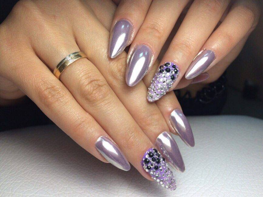 Можно создать похожий маникюр, поэкспериментировав с камнями. Например, на одном ногте разложить разные по величине и цвету камни. Это будет смотреться оригинально и нарядно. Цвет можно подобрать любой: фиолетовый, серый, бирюзовый и другие.