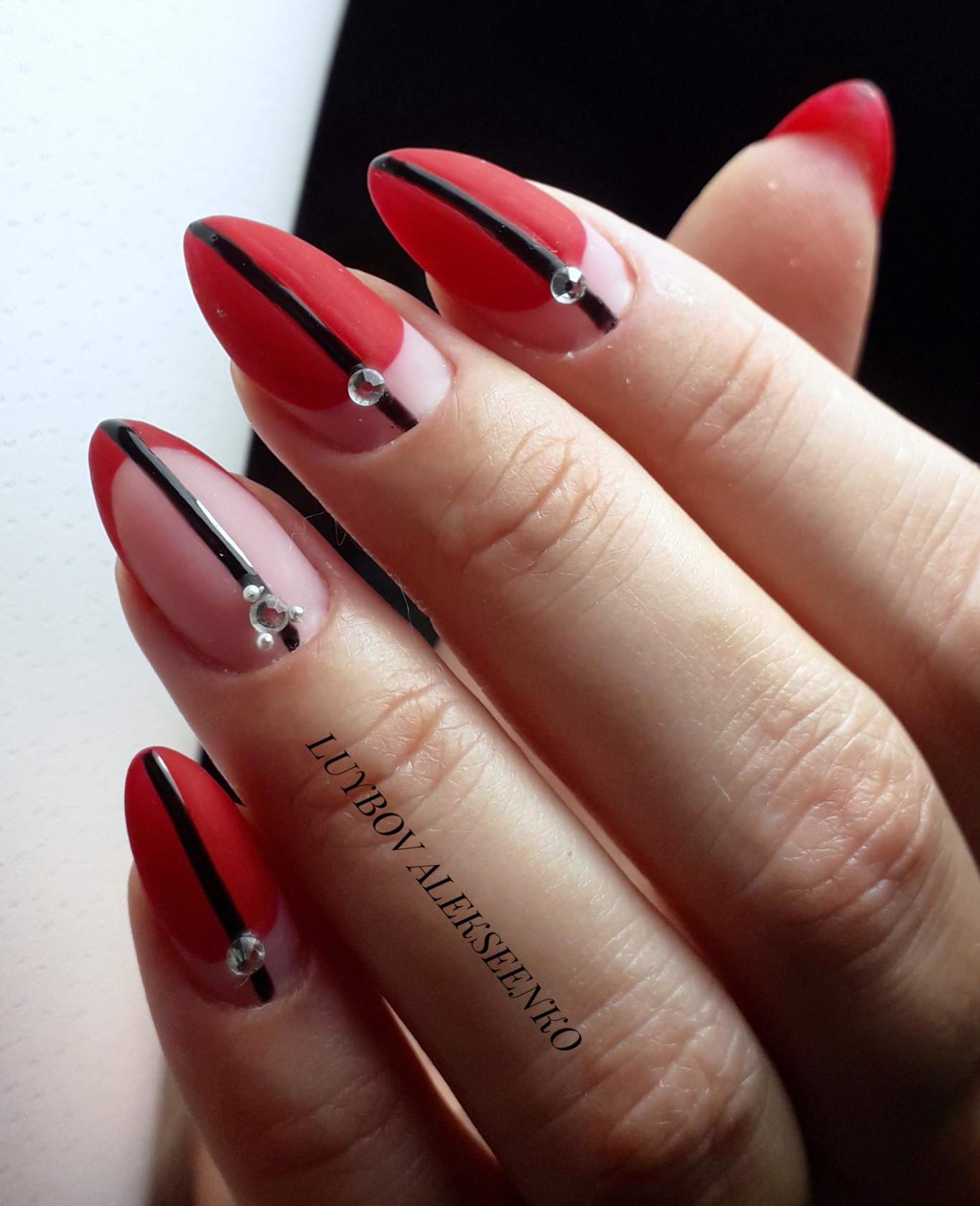 Красный маникюр со стразами подходит стильным, уверенным в себе женщинам. Чтобы убрать излишнюю яркость, покройте ногтевые пластины матовым лаком. А в качестве украшения используйте белые круглые стразы, похожие на жемчуг. Для вечернего выхода дополните образ красной сумочкой и помадой.