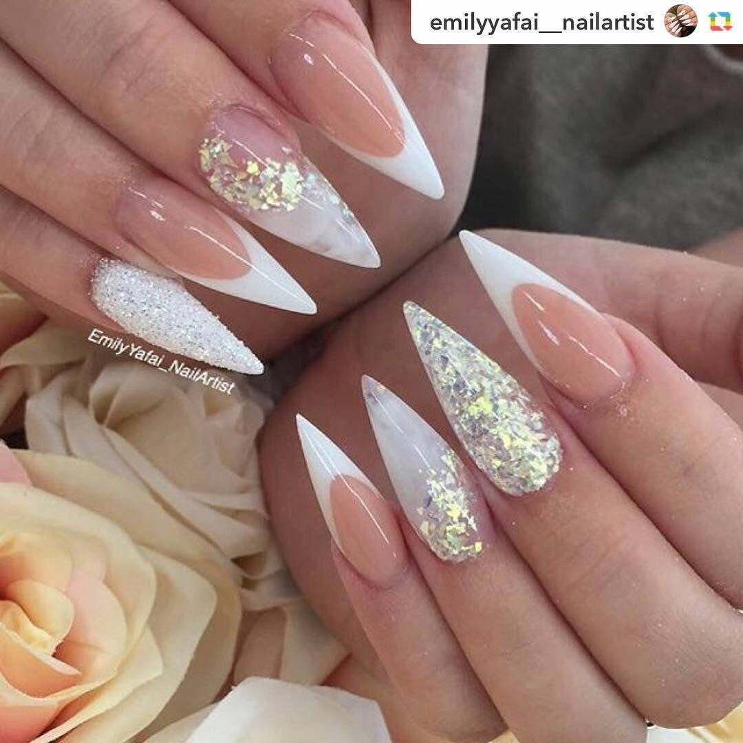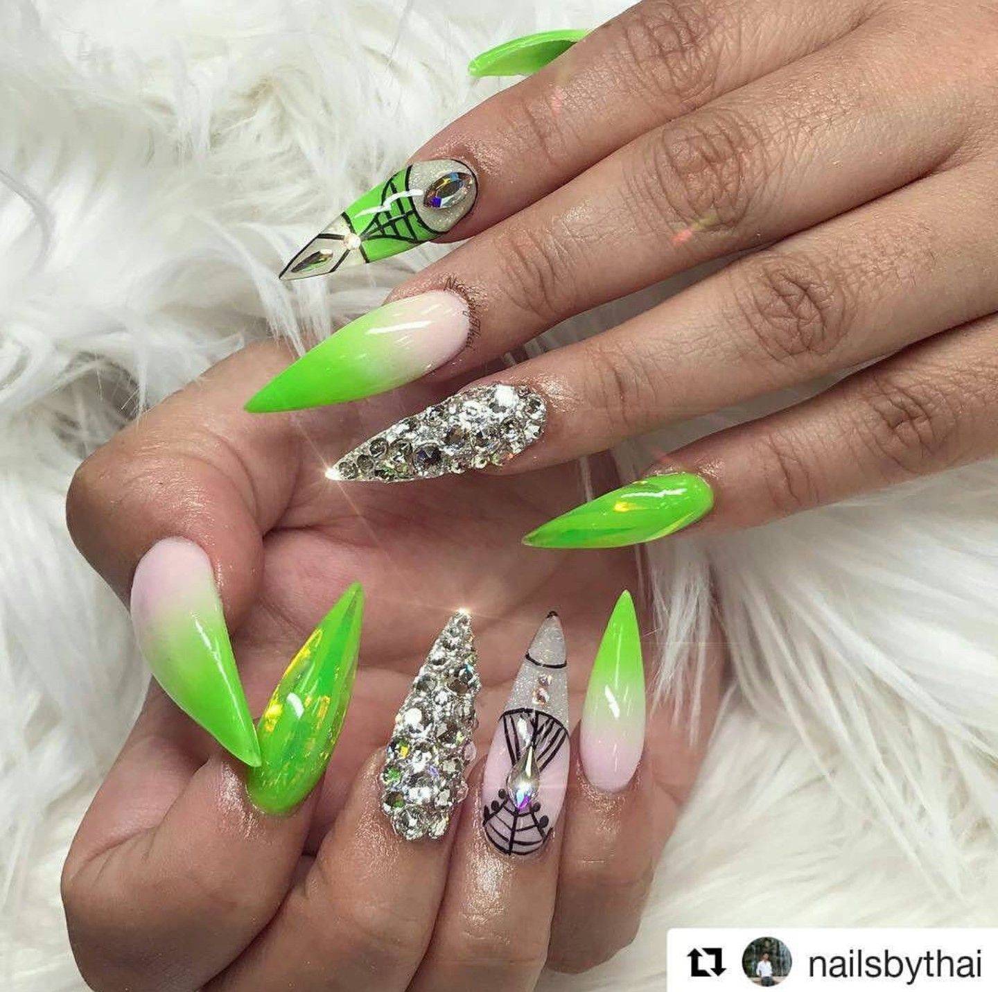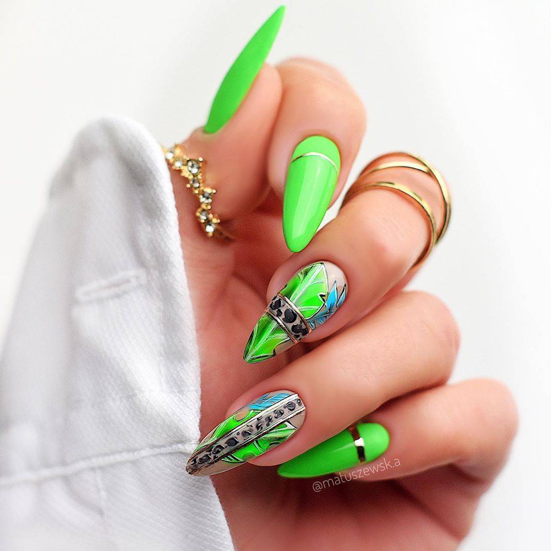 Не исключены нейл-арты в лимонном, оранжевом, ярко-зеленом цветах. Яркий острый маникюр подойдет для обладательниц светлой кожи. Для девушек с загорелой кожей рекомендуется использовать светлые или белые нейл-арты.