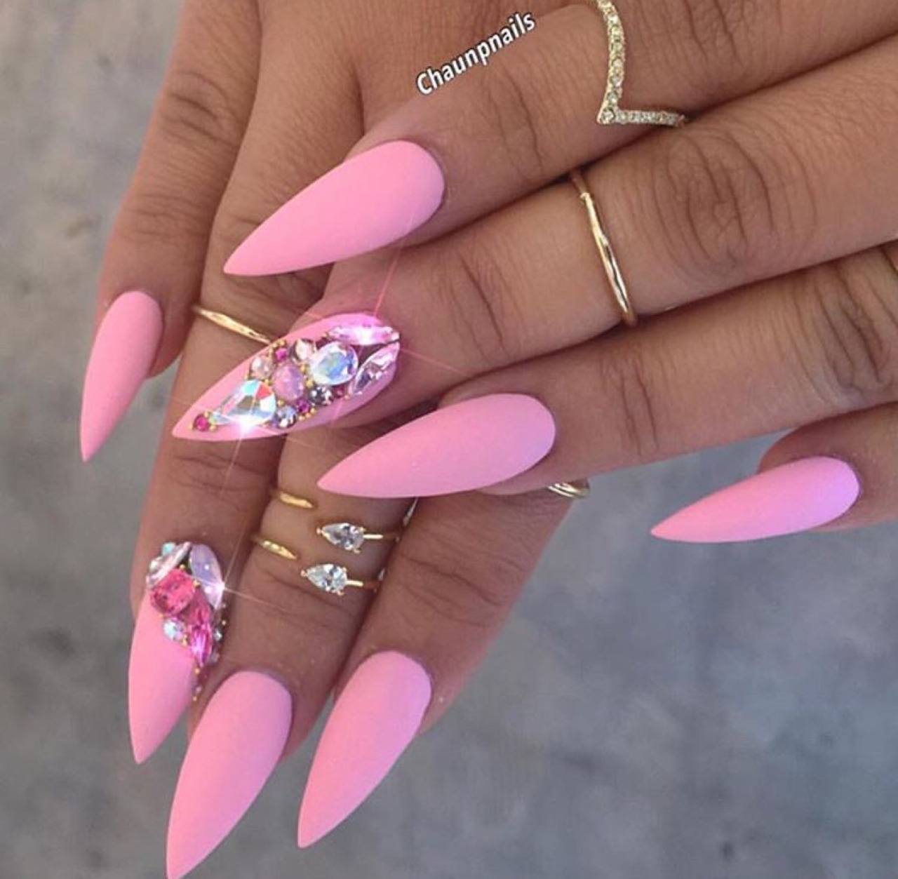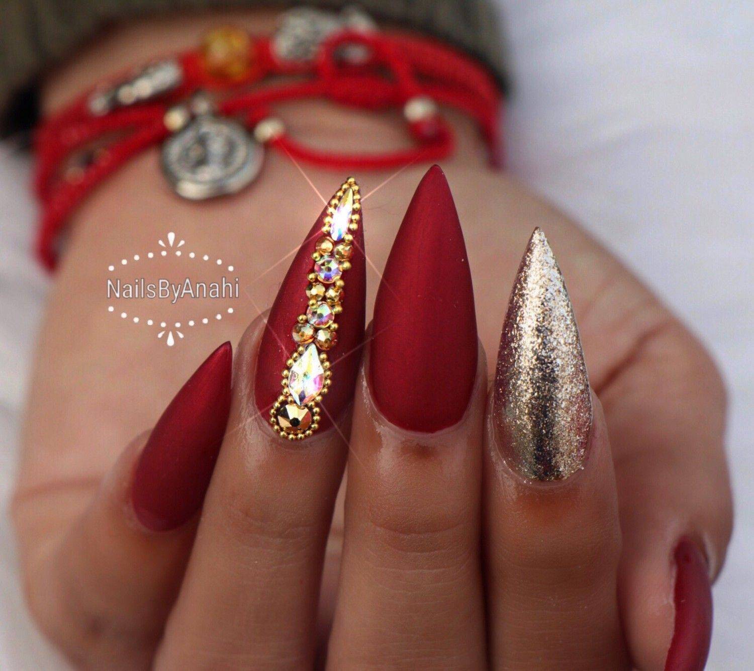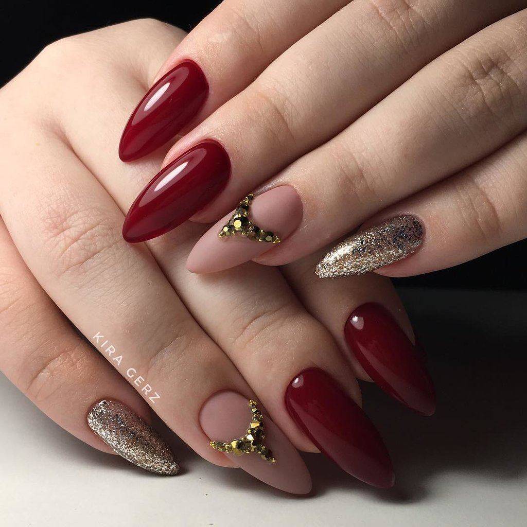 Обладательницы длинных ногтей хорошо знают как облагородить и смягчить свои нейл-арты. Для этого они используют матовую текстуру, меланж, “сахарок” и другой материал, придающий ноготкам бархатистую нежность. Матовый маникюр на острых ногтях может быть выполнен в темных насыщенных оттенках. Чаще всего для дизайна используют бордовый и черный цвета. Стразы располагают классическим способом: в прикорневой зоне, посередине ногтя полоской, поперек ногтя, в виде волны.