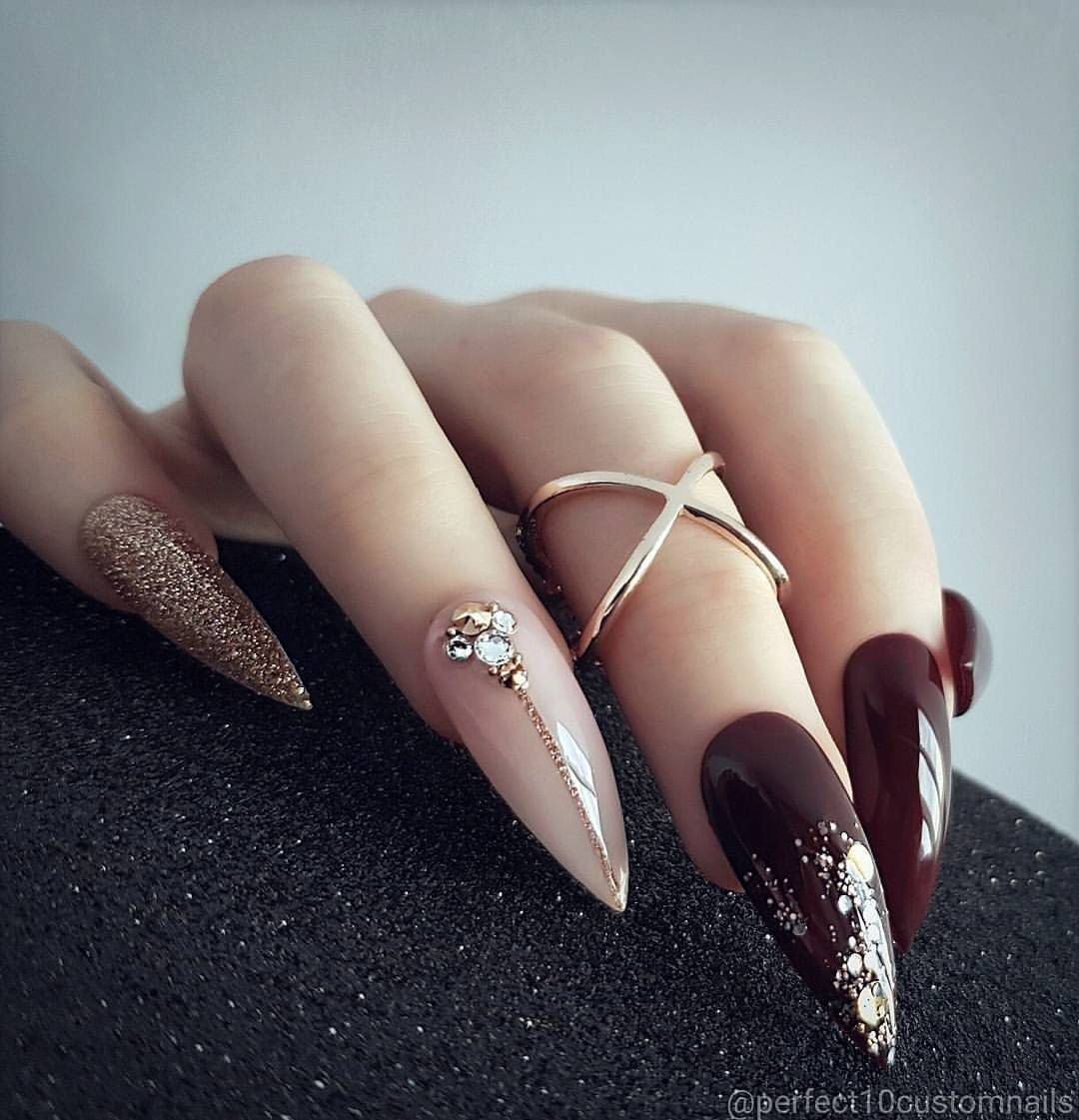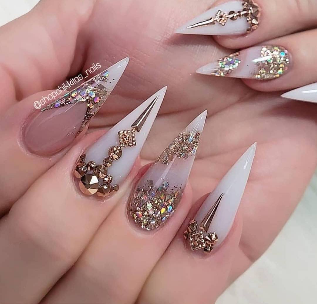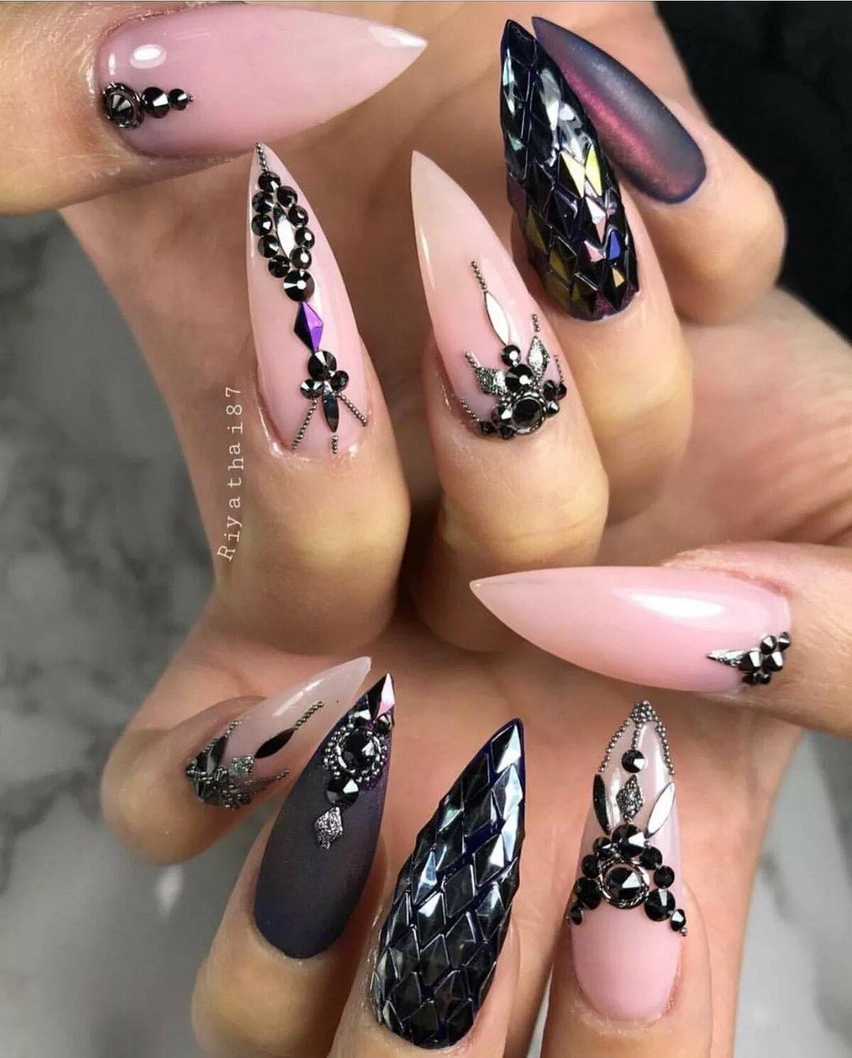 Острые ногти – выбор далеко не каждой женщины. Форма ногтей смотрится очень выразительно и заметно, к тому же часто нуждается в коррекции. Если вы счастливая обладательница острых ногтей, то не бойтесь экспериментировать с декором. Предлагаем вам большую фото-подборку шикарных идей острого маникюр со стразами. Выбирайте и создавайте подобные нейл-арты на своих ноготках.