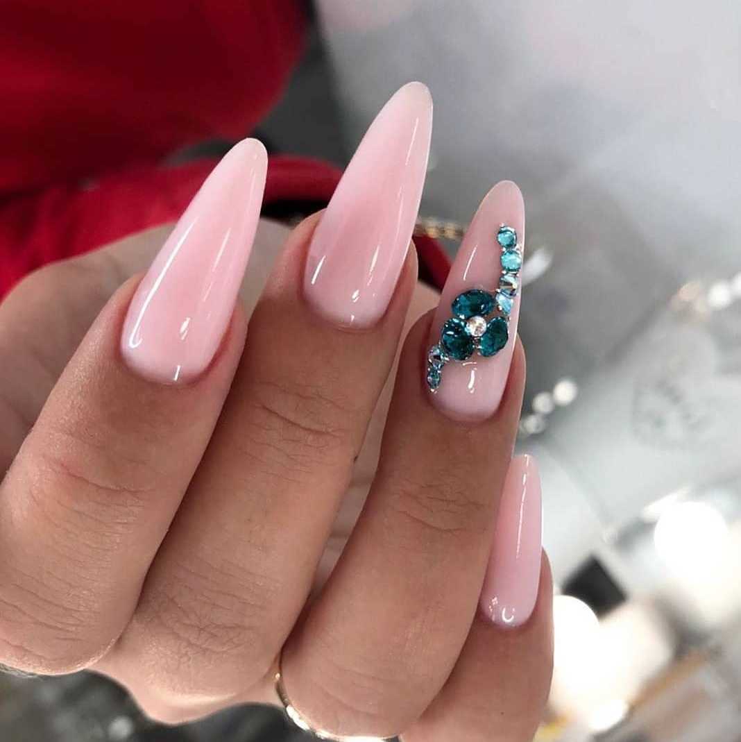 Лидеры светлых оттенков модного миндального маникюра со стразами – непревзойденные и горячо любимые нюдовые и пастельные тона. Миндальный нюдовый маникюр со сдержанными и неброскими акцентами из страз – пример самодостаточности и гармоничности дизайна, такое естественное и женственное решение