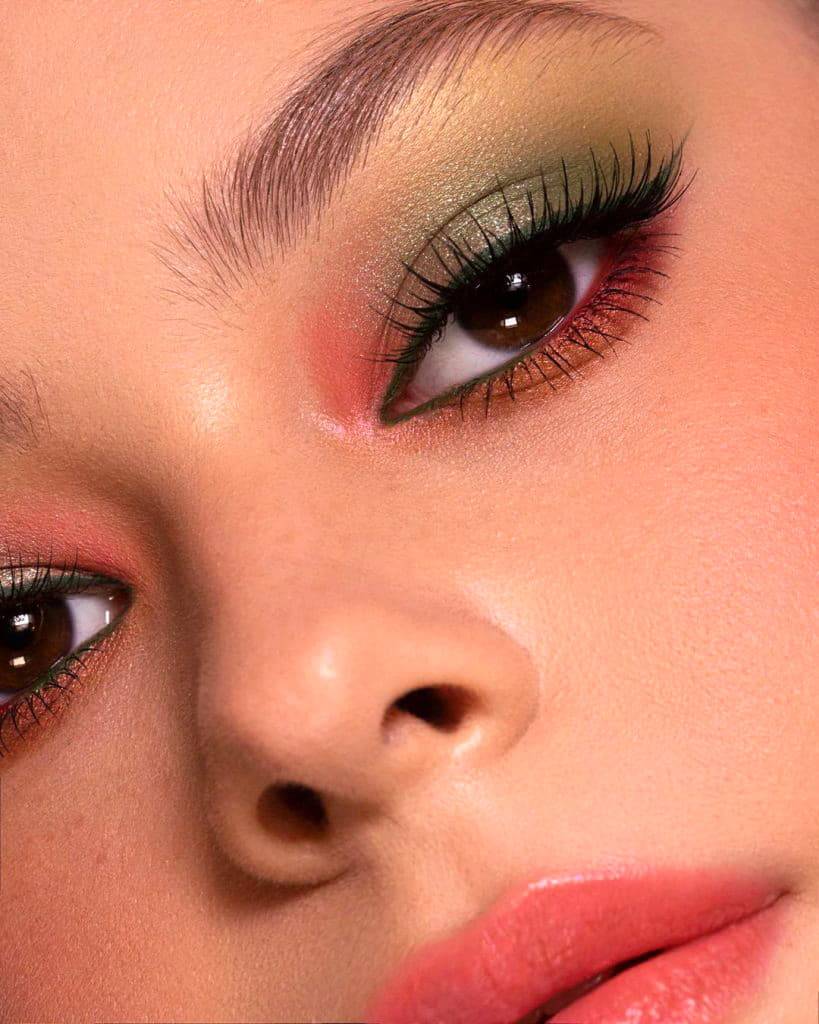 В цветовой гамме макияжа должны преобладать теплые краски: жёлтый, оранжевый, коралловый, лососевый, терракотовый. Это касается не только продуктов для век, но и остальных средств, которые вы наносите на кожу. Тёплые скульпторы и румяна сочетаются с любыми оттенками зелёного.